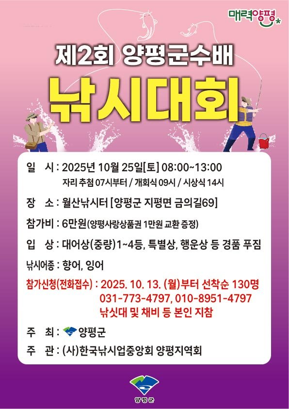 [금요저널] 양평군(군수 전진선)은 오는 25일 관내 월산낚시터에서 ‘제2회 양평군수배 낚시 대회’를 개최한다고 밝혔다.