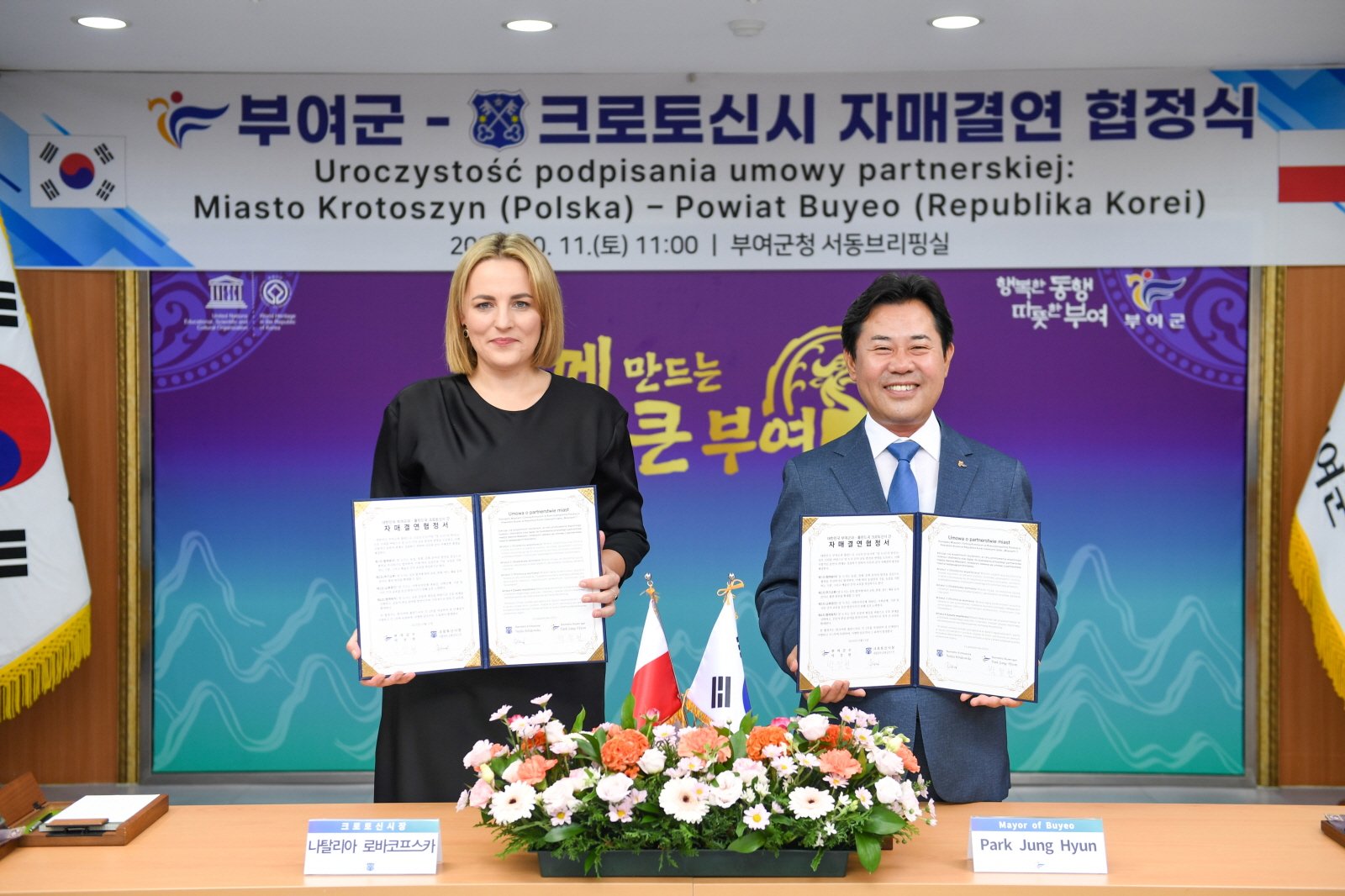 나탈리아 로바코프스카 크로토신시장은 “그동안의 노력으로 부여군과의 자매결연을 공식 체결한 것을 매우 뜻깊게 생각한다”라며 “이번 협정을 계기로 농업·경제 등 다양한 분야에서 교류가 확대되고 양 도시가 신뢰와 우정을 바탕으로 지속 가능한 발전을 함께 이루길 기대한다”라고 말했다.
