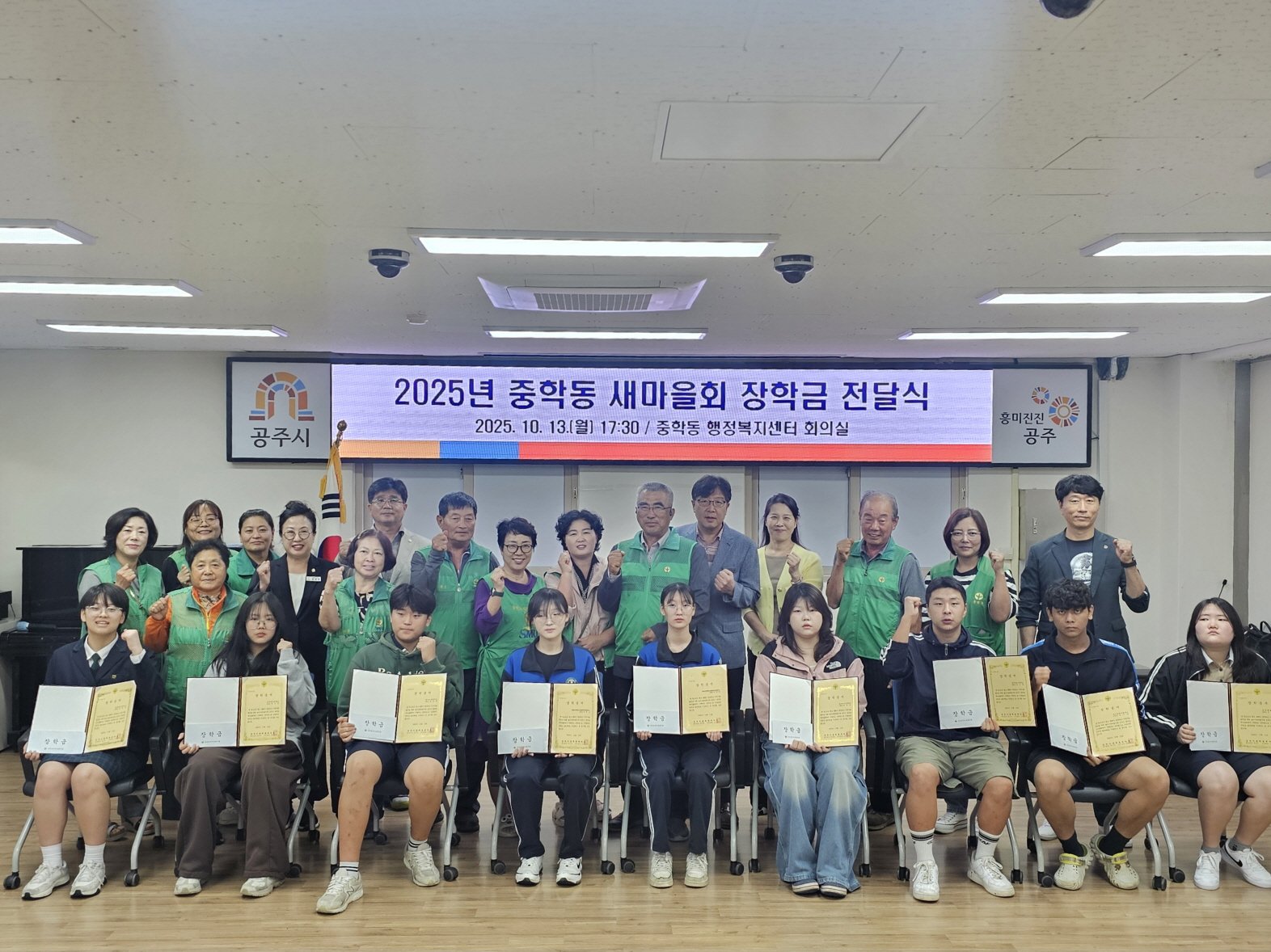 [금요저널] 공주시 중학동 새마을회(협의회장 정인묵, 부녀회장 오연욱)는 지난 13일 중학동 행정복지센터에서 모범 청소년 10명에게 장학금을 전달했다.