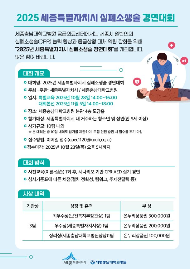 [금요저널] 세종시(시장 최민호)가 다음달 5일 세종충남대학교병원 도담홀에서 개최하는 2025년 세종시 심폐소생술(CPR) 경연대회 참가자를 모집한다.