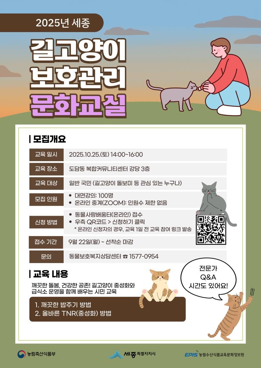 [금요저널] 세종시(시장 최민호)가 오는 25일 도담동 행복누림터(복합커뮤니티센터) 강당에서 길고양이 보호관리 문화교실을 연다고 밝혔다.