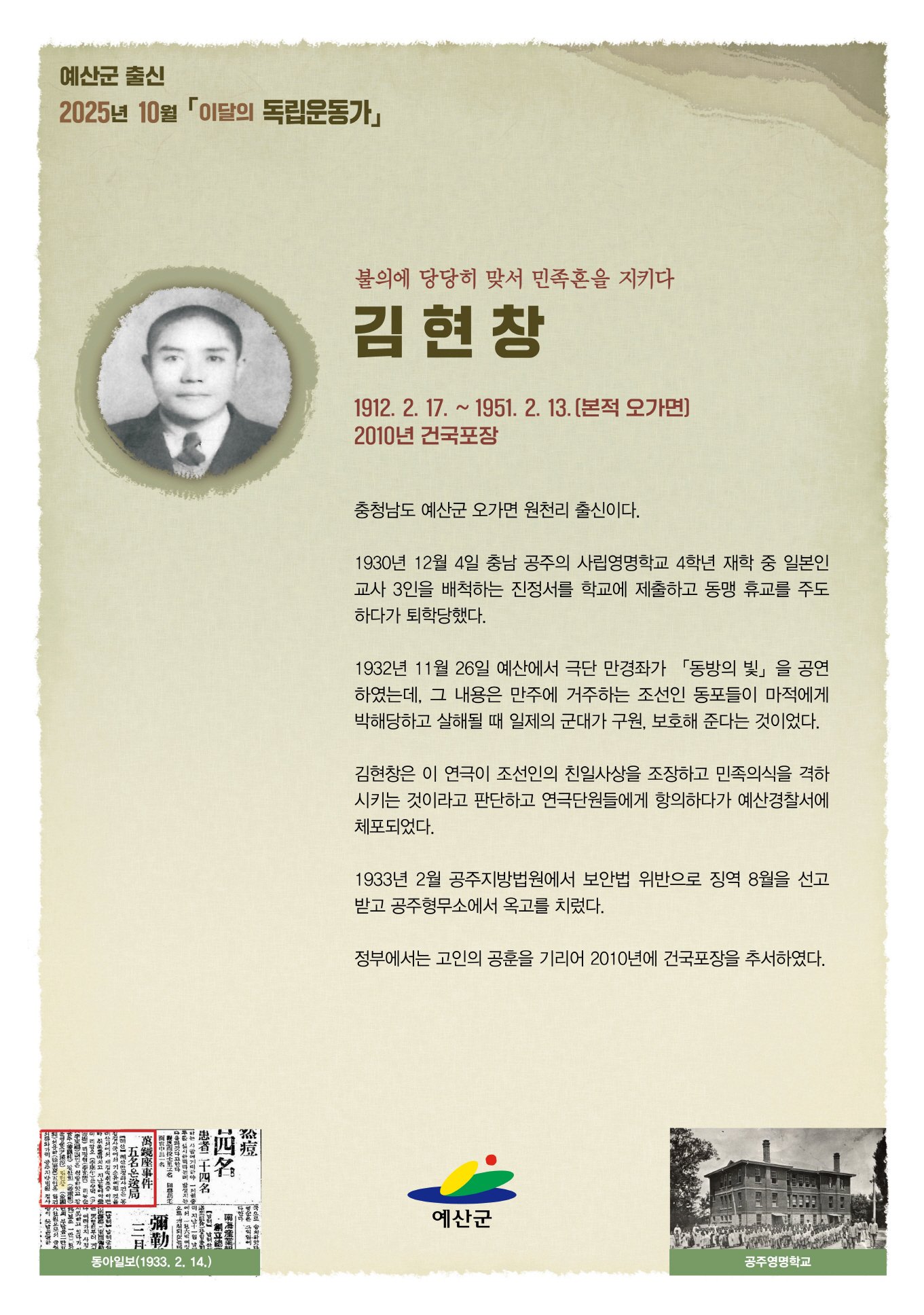 2025년 10월 이달의 독립운동가 포스터(김현창) (사진제공=예산군)