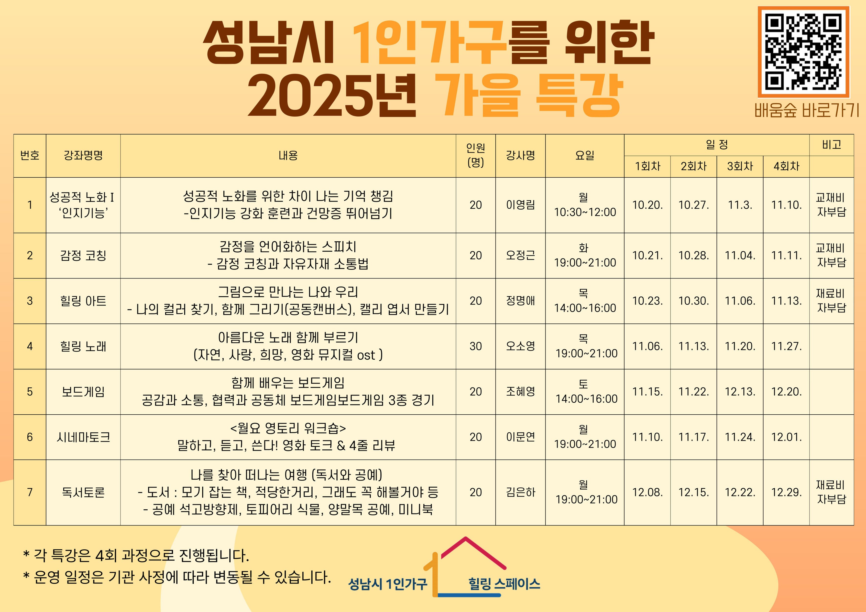 [금요저널] 성남시(시장 신상진)는 오는 10월 20일부터 12월 29일까지 중원구 하대원동 1인 가구 힐링스페이스에서 총 150명이 참여하는 7개 과목(과목별 20~30명)의 특강을 연다.