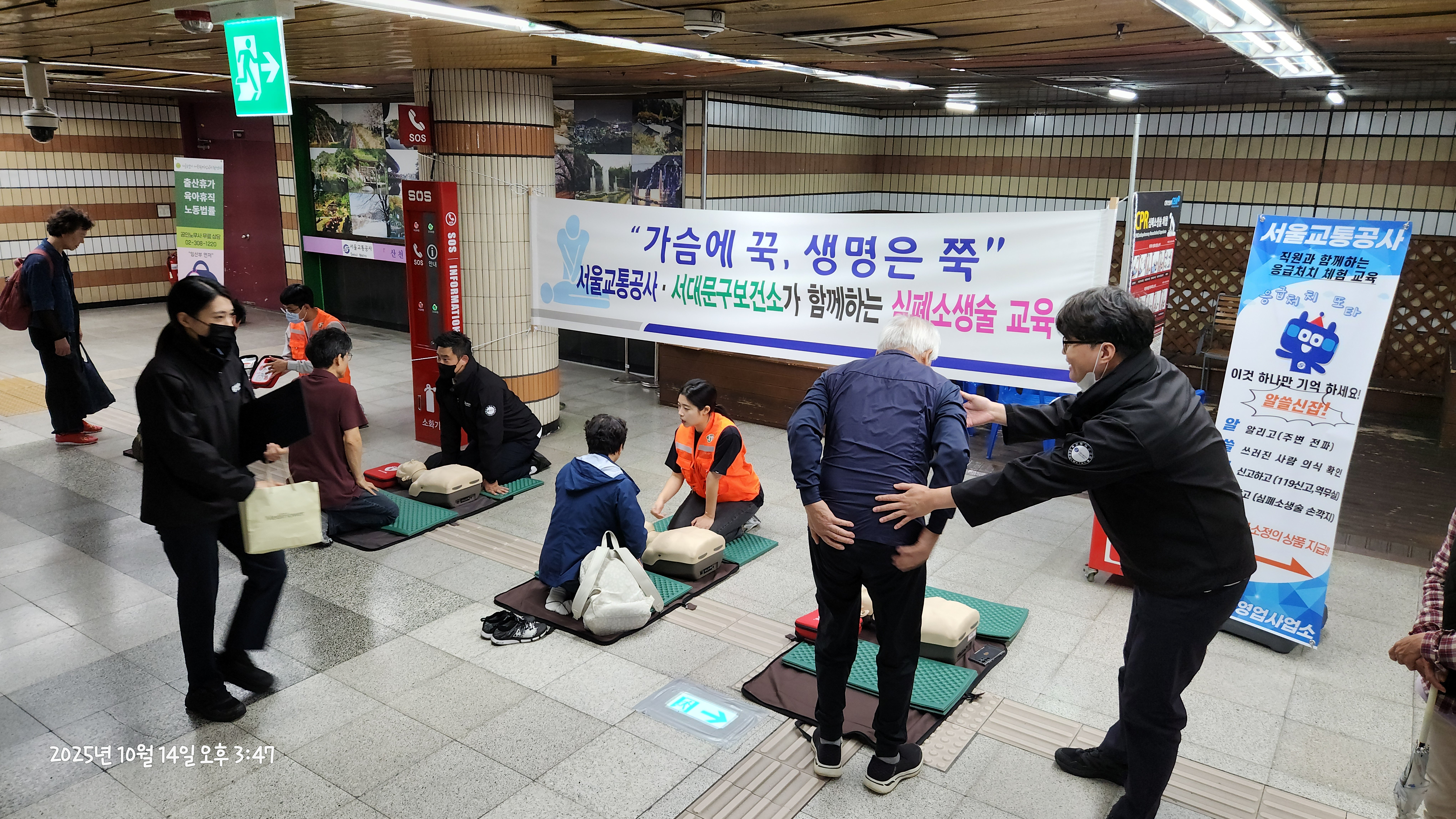 홍제역에서 실시된 서울교통공사 경복궁영업사업소와 서대문보건소가 함께하는 심정지 환자 응급처치 체험교육 현장 방문하여 보안관과 보건소 대원 격려 / 묻지마 폭행 및 살인의 공포, 모르는 이와의 불필요 접촉 지양이 퍼진 사회 현실에서 이웃사랑을 다시금 실천할 수 있는 멋진 사회공헌 활동임을 예찬