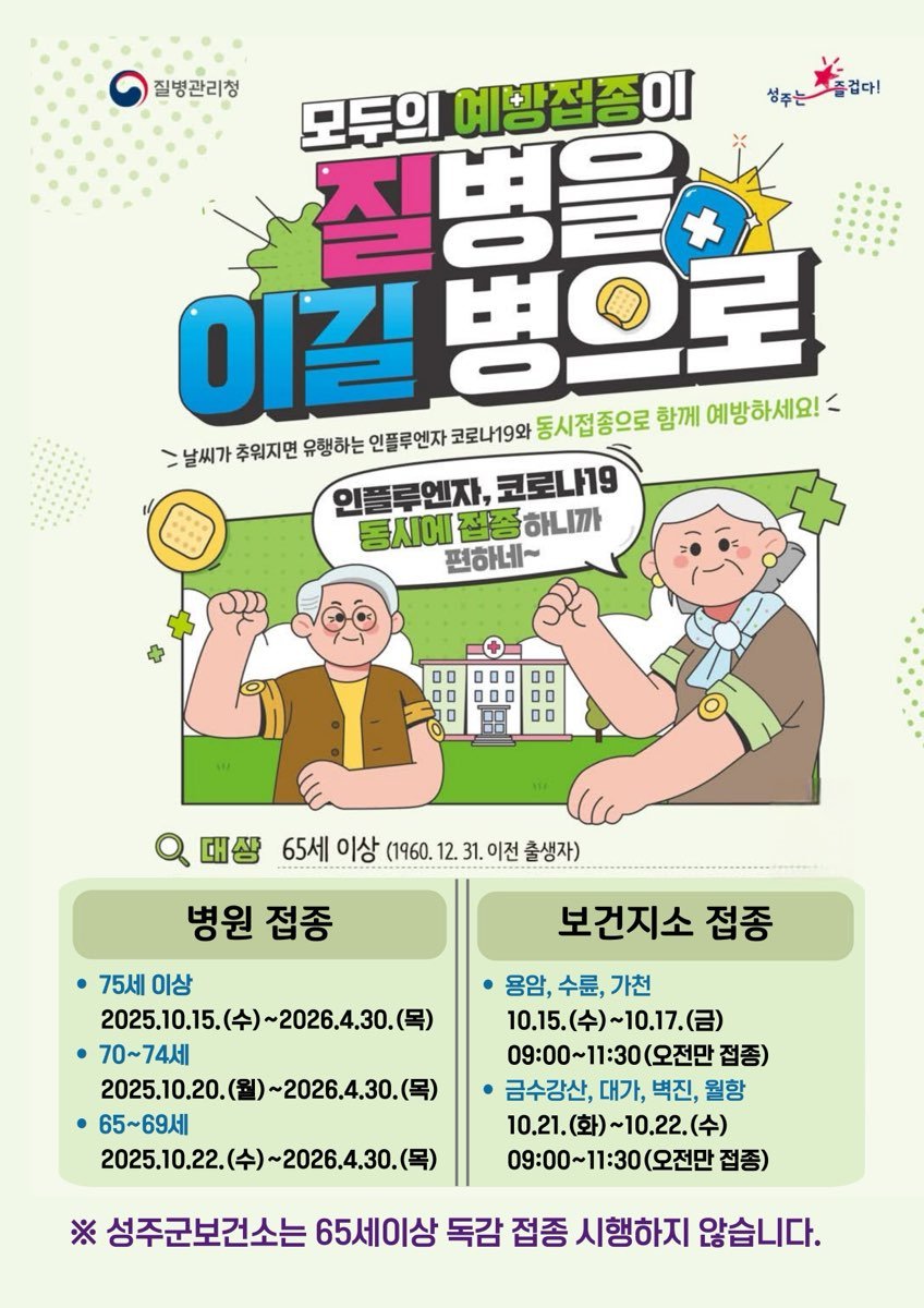 성주군 관계자는 “ 겨울철 인플루엔자 유행에 대비해 예방접종을 적극 권장하며 아울러 코로나19 예방접종도 동시접종 가능하니 함께 접종해 겨울철 건강을 지켜줄 것을 ”당부했다.