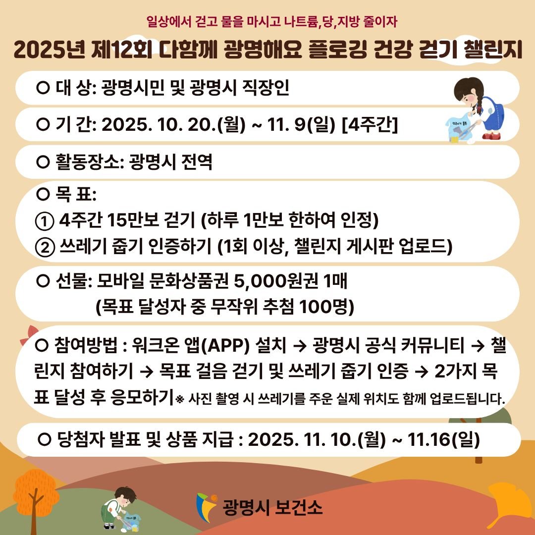 이번 걷기 챌린지는 시민 건강 증진과 함께 일상 속 환경 보호를 실천하는 시민 참여형 프로그램으로 광명시민과 시 관내 직장인이면 누구나 참여할 수 있다.