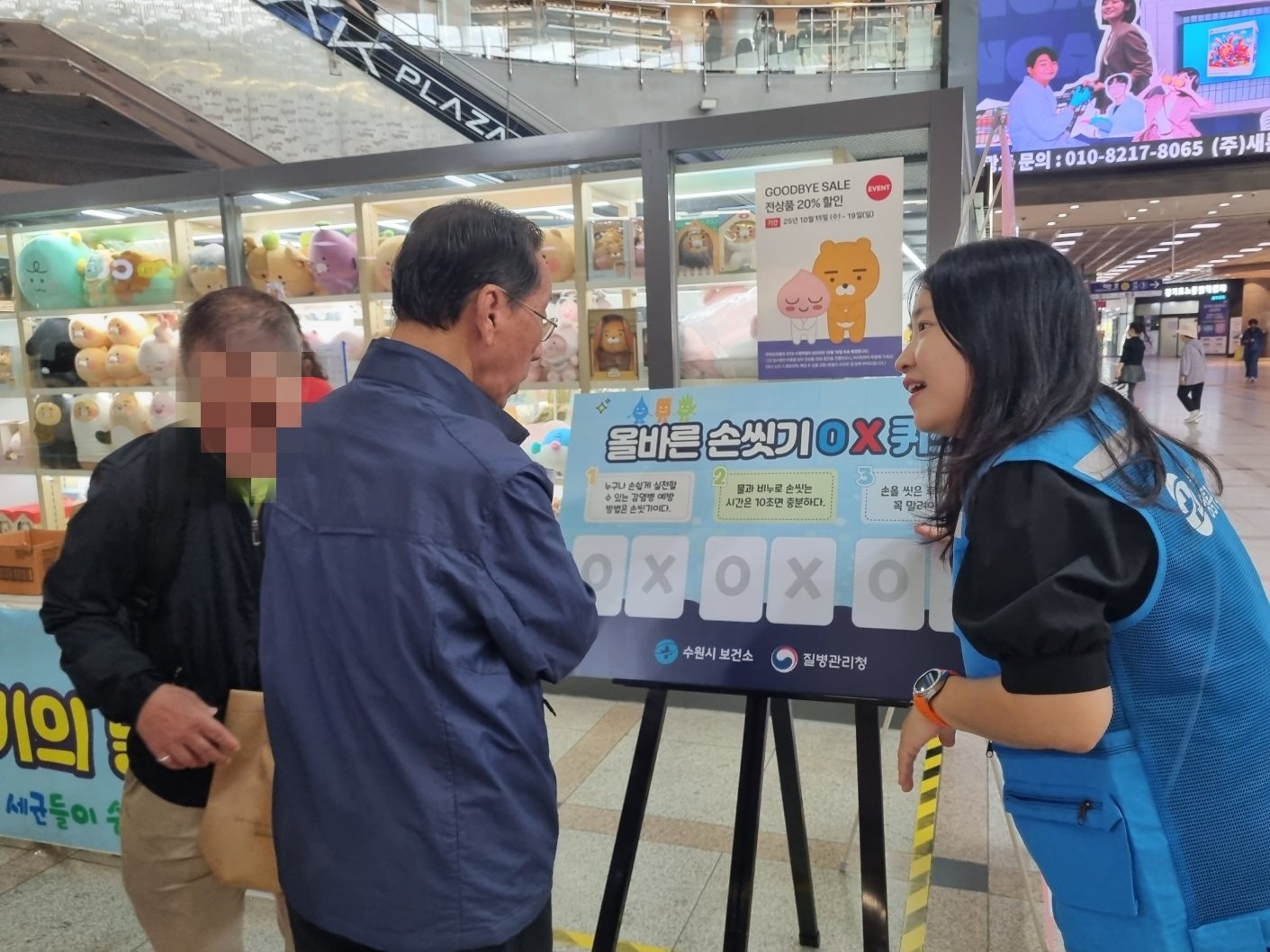 [금요저널] 수원시보건소는 ‘세계 손씻기의 날’(10월 15일)을 맞아 15일 수원역 2층 대합실에서 감염병 예방 캠페인을 펼쳤다.