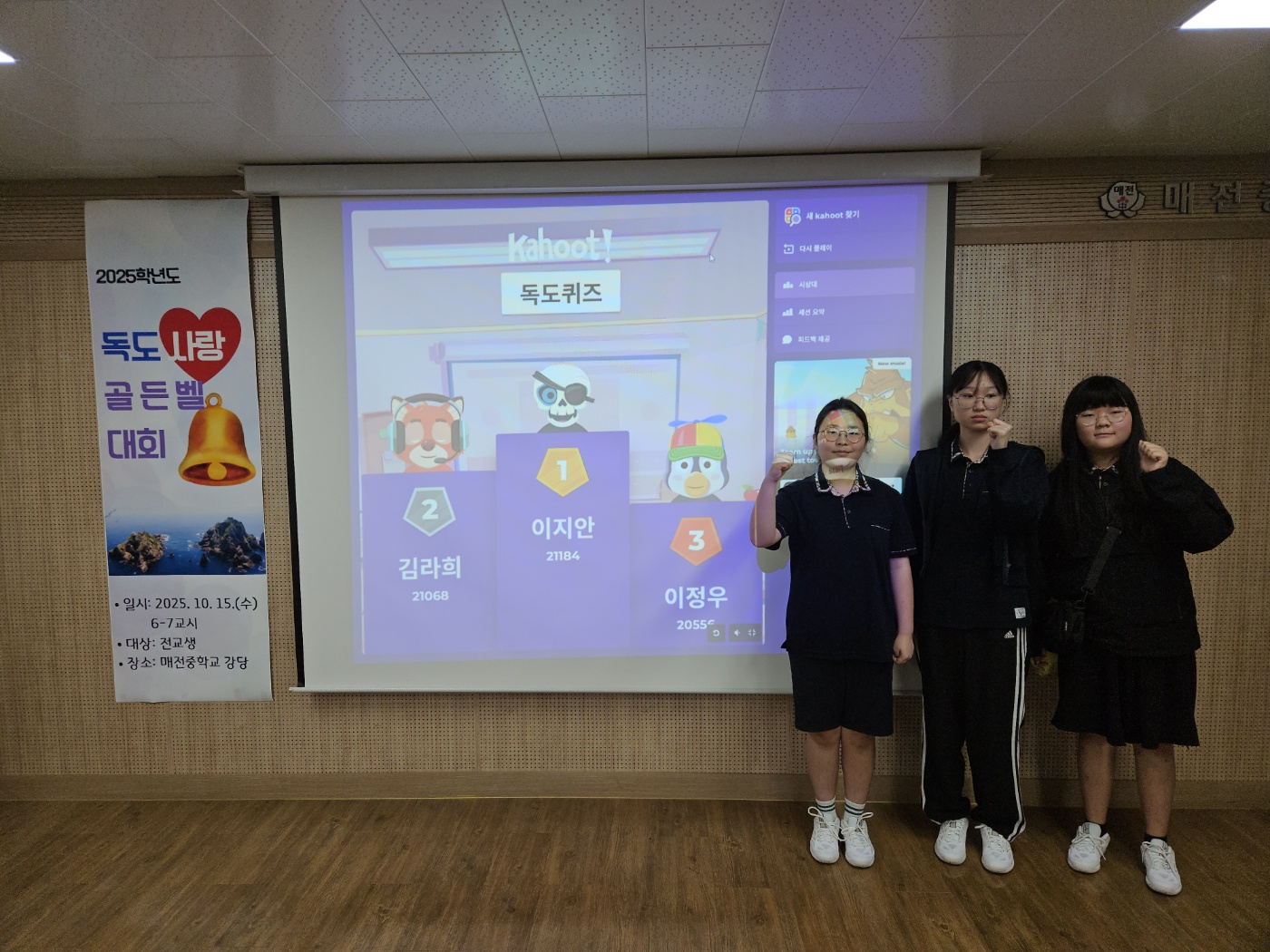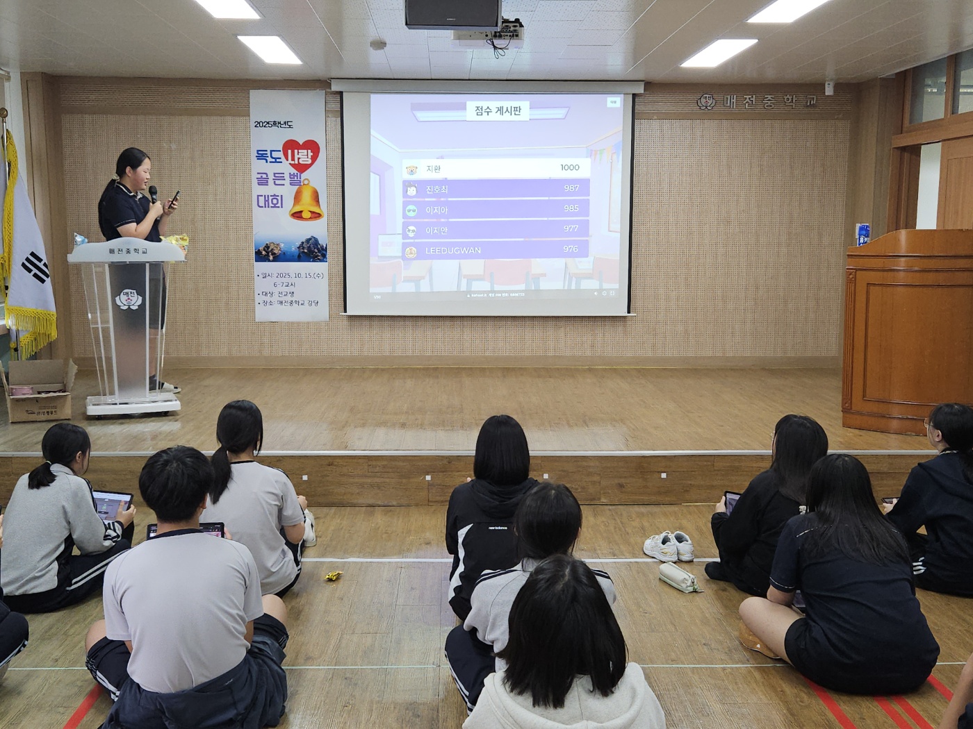□ 매전중학교(교장 김기빈)는 2025년 10월 15일, 전교생을 대상으로 ‘독도 골든벨’ 행사를 실시하였다. 이번 행사는 다가오는 10월 25일 ‘독도의 날’을 기념하고, 학생들이 독도에 대해 깊이 이해하며 수호 의지를 키우는 계기를 마련하기 위해 기획되었다.