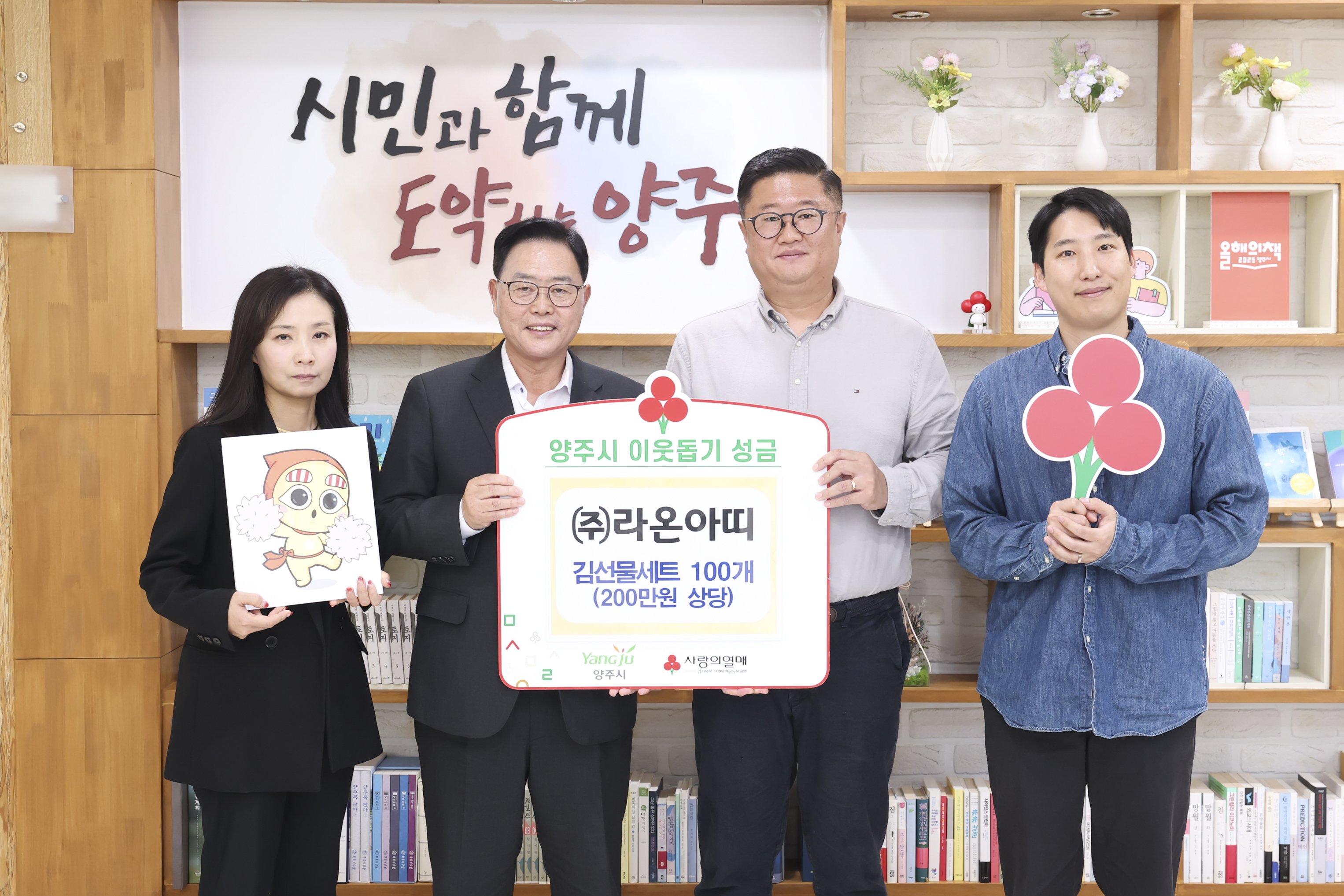 강수현 양주시장은 “매년 꾸준히 다양한 사회공헌활동을 통해 지역사회 발전에 힘쓰시고 있는 라온아띠 대표님과 임직원분들께 진심으로 감사드린다”며 “기탁받은 성품은 지역의 어려운 이웃을 돕는데 소중하게 쓰겠다”고 전했다.