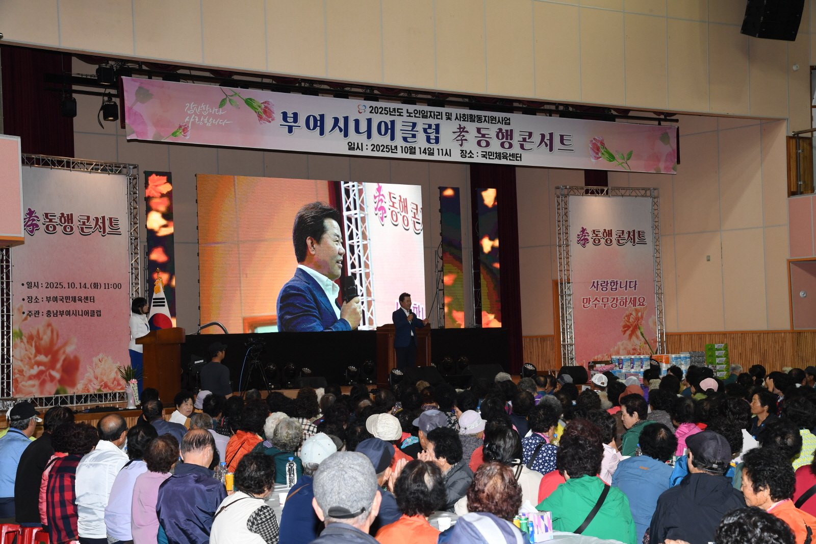 [금요저널] 부여시니어클럽은 지난 14일 부여국민체육센터에서 노인일자리 및 사회활동 지원사업 참여 어르신 약 1,800명을 대상으로 문화 활동인 ‘孝 동행 콘서트’ 행사를 성황리에 개최했다.
