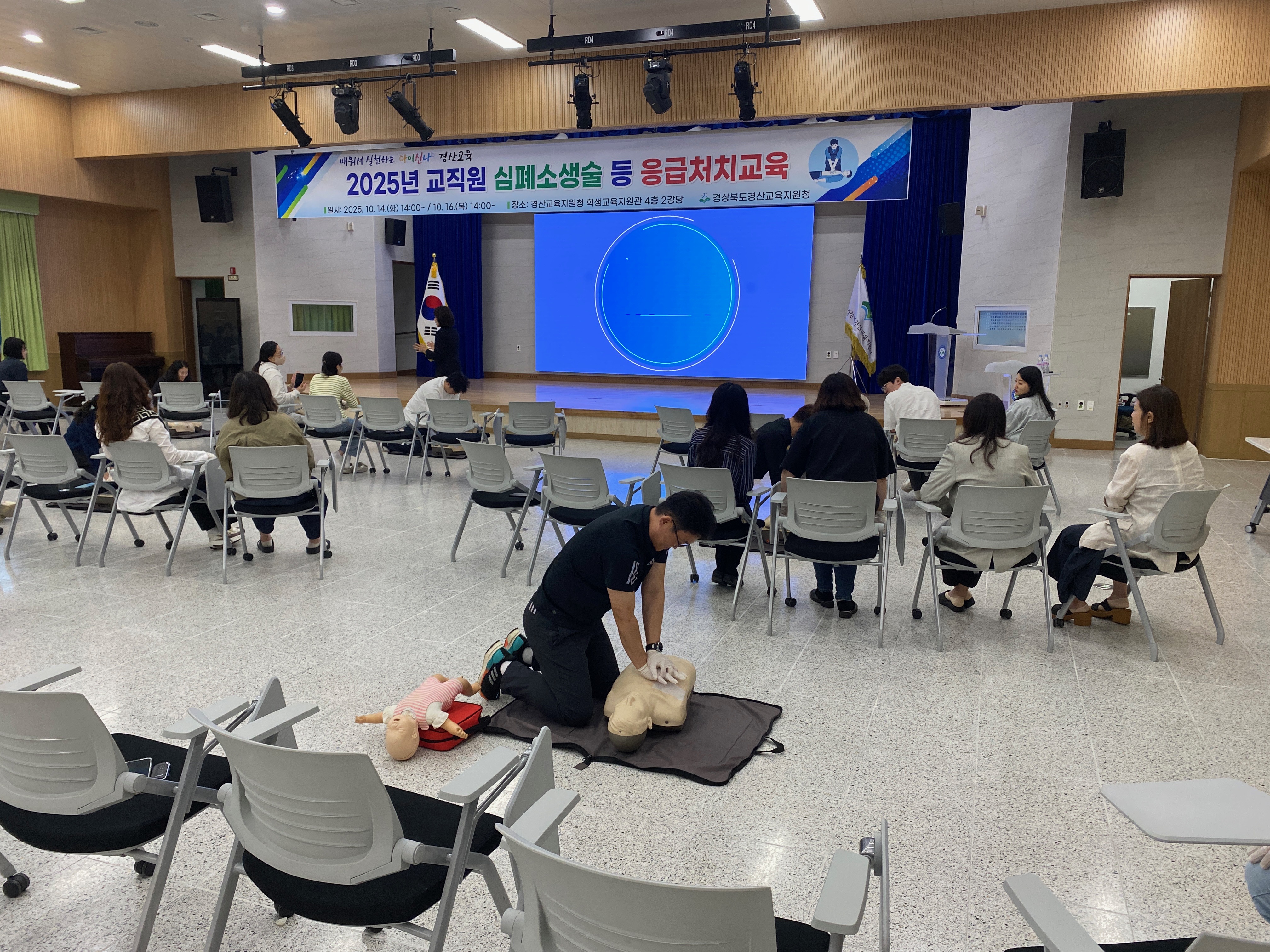 경산교육지원청(교육장 정수권)은 10월 14일(화), 16일(목) 2회에 걸쳐 경상북도경산교육지원청 학생교육지원관 4층 2강당에서 청 직원 120여 명을 대상으로 심폐소생술 등 응급처치 교육을 실시했다.