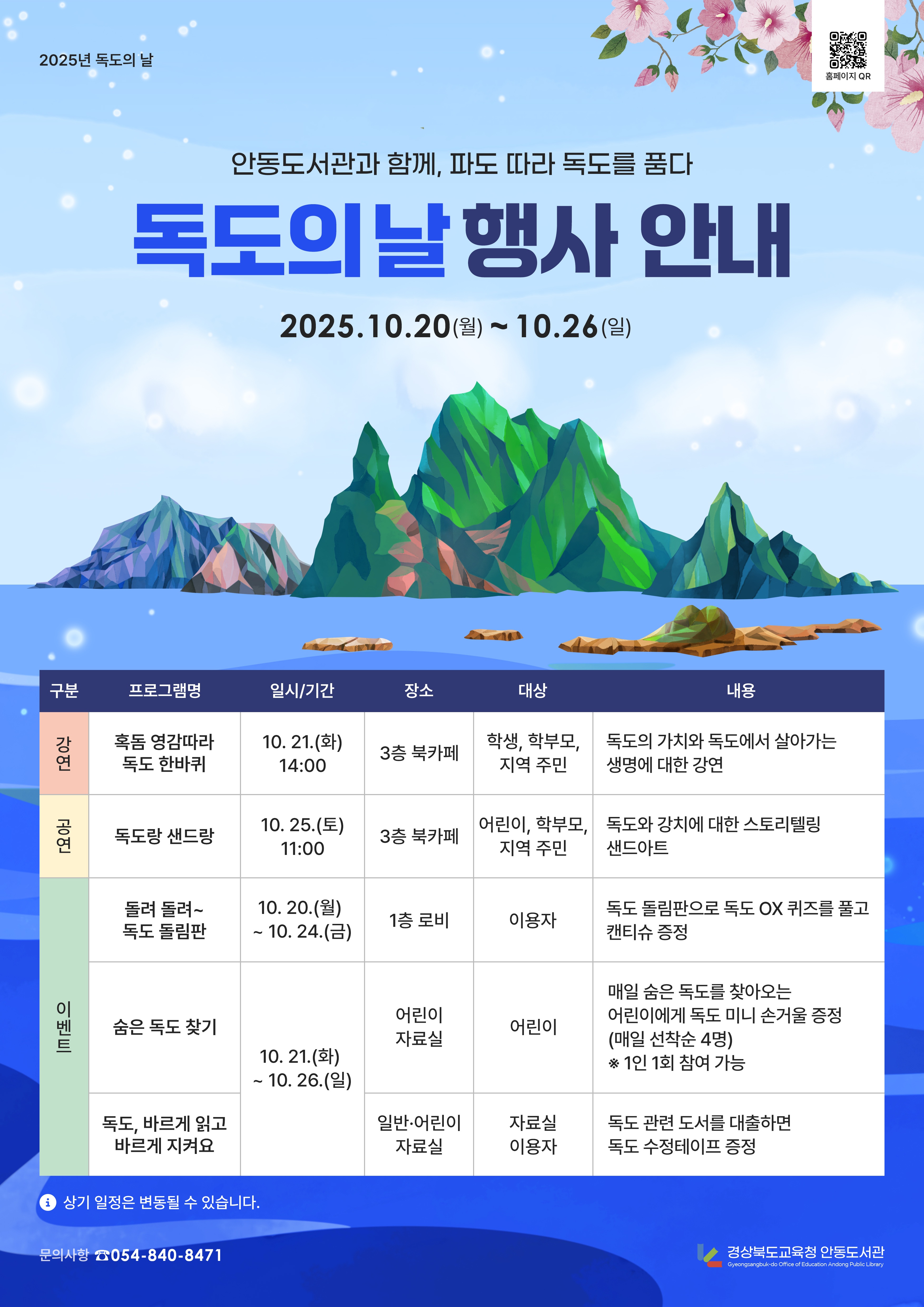 □ 경상북도교육청 안동도서관(관장 반선자)은 10월 25일(토)‘독도의 날’을 맞아 10월 20일(월)부터 26일(일)까지 지역 주민과 함께하는 기념 행사를 운영한다.