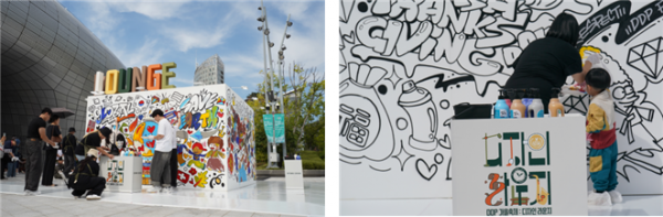 특히 팔거리 중앙에 설치된 대형 구조물 ‘디 아트 큐브’에는 그래피티 아티스트 코마의 밑그림 위에 시민들이 색을 입히며 협업 작품이 완성됐다.