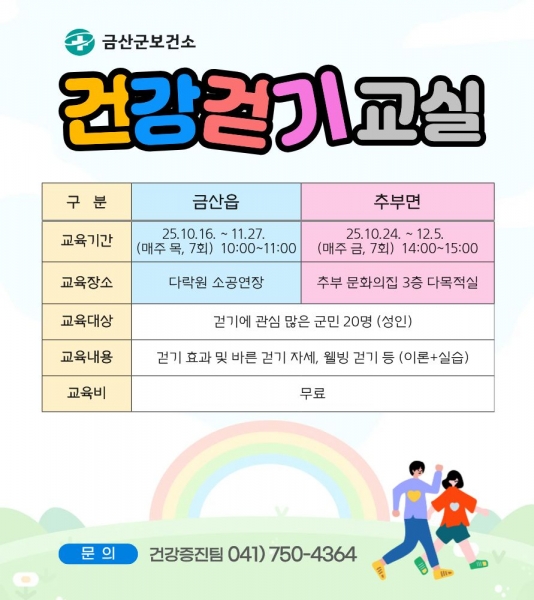 [금요저널] 금산군보건소는 군민의 건강증진과 생활 속 신체활동 실천을 위해 오는 12월까지 금산읍·추부면에서 건강 걷기 교실을 운영한다.