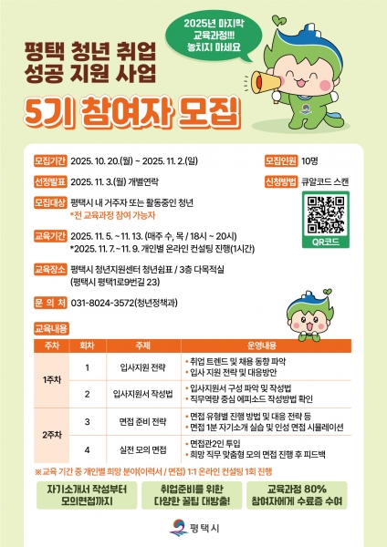 5기 교육은 11월 5일부터 13일까지 2주 / 4회 오후 6시~20:00 평택시 청년 지원센터 ‘청년쉼,표’에서 진행되며 △취업트렌드 및 공개채용 동향 파악 △입사지원서 작성법 및 직무역량 중심 에피소드 작성법 △면접 유형별 진행 방법 및 대응 전략 △면접 1분 자기소개 실습 및 인성 면접 시뮬레이션 △실전 모의면접을 진행하며 교육 기간 중 1:1 개별 온라인 컨설팅이 제공된다.