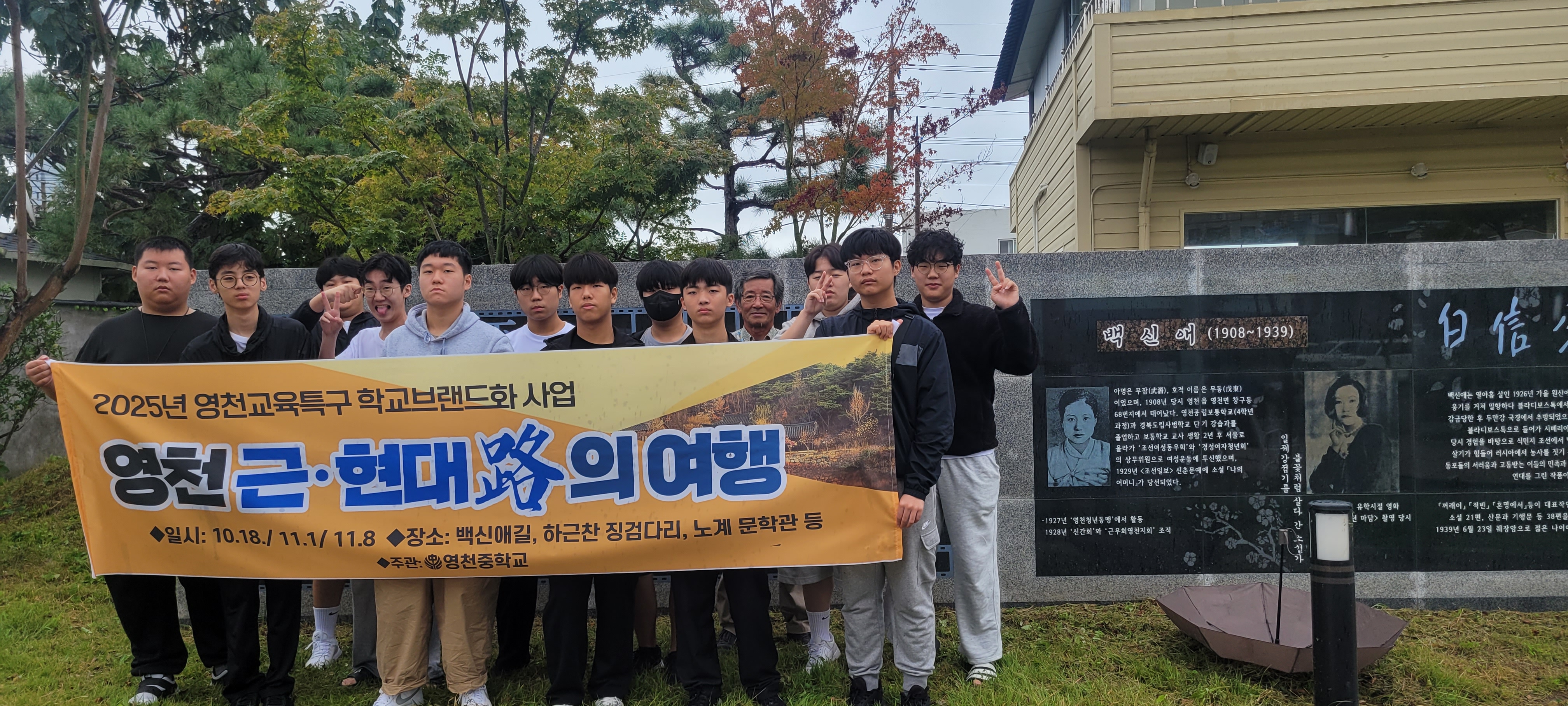 □ 지난 10월 18일 첫 번째 프로그램에서는 3학년 학생 15명이 참여하여 백신애기념사업회 이중기 작가의 안내로 백신애 작가의 생애와 문학세계를 탐방했다. 학생들은 영천 창구동 백신애길을 걸으며 작품 『멀리 간 동무』의 배경이 된 서문거리 일대를 체험하고, 작품 속 시대 상황과 현재의 영천을 비교하며 문학과 지역의 연결성을 직접 체감했다. 이날 학생들은 백신애길 플로깅(길 걷기 환경정화) 활동도 함께 진행하며, 지역 문학 체험과 환경보호 실천을 병행하는 의미 있는 시간을 보냈다.