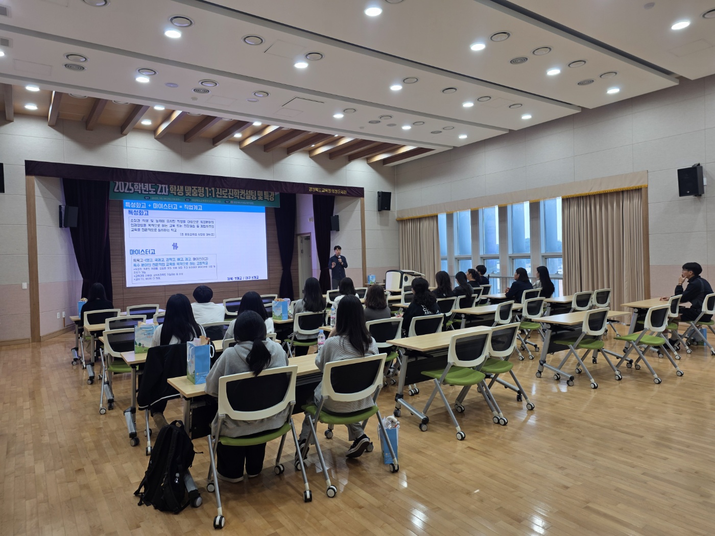 경상북도의성교육지원청(교육장 이우식)은 2025년 10월 18일(토) 오전 9시부터 12시 50분까지 의성도서관 3층에서 「2025학년도 학생 맞춤형 진로 진학 컨설팅(2차)」를 실시하였다. 이번 컨설팅은 중학교 3학년(예비 고1)부터 고등학교 2학년까지 학생과 학부모 32명을 대상으로 진행되었으며, 경북진학지원센터의 전문 강사를 초빙하여 고입과 대입에 대한 구체적인 정보를 전달하고 학생 개개인에 맞는 진로 진학 상담을 제공하였다.