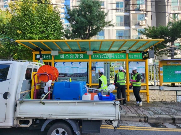 아산시, 깨깔산멋 아산 조성을 위한 버스승강장 물청소 실시