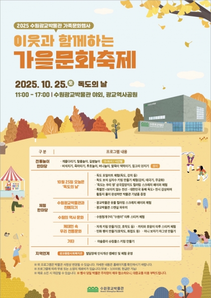 [금요저널] 수원광교박물관은 독도의 날인 10월 25일 오전 11시부터 오후 5시까지 수원광교박물관 야외에서 ‘2025 수원광교박물관 가족문화행사–이웃과 함께하는 가을문화축제’를 연다.