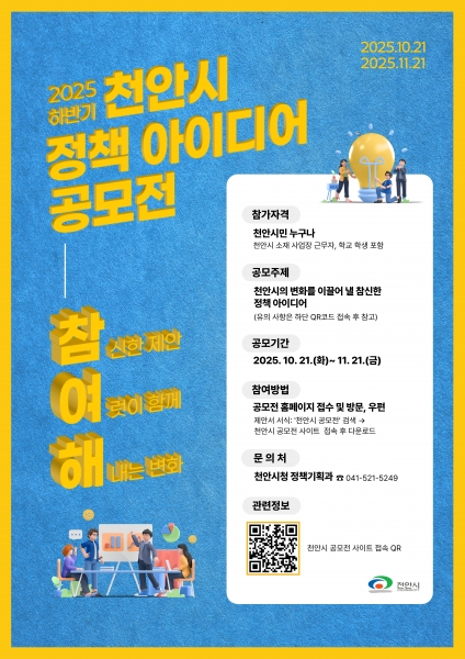 [금요저널] 천안시는 시민이 직접 참여해 참신한 아이디어로 시정 변화를 만들어가는 ‘2025 하반기 천안시 정책 아이디어 공모전’을 개최한다고 21일 밝혔다.