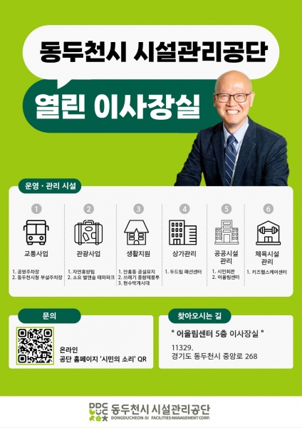 [금요저널] 동두천시 시설관리공단은 시민과의 소통을 강화하고 현장의 목소리를 경영에 적극 반영하기 위해 10월부터 ‘열린 이사장실’을 연중 상시 운영한다고 밝혔다.