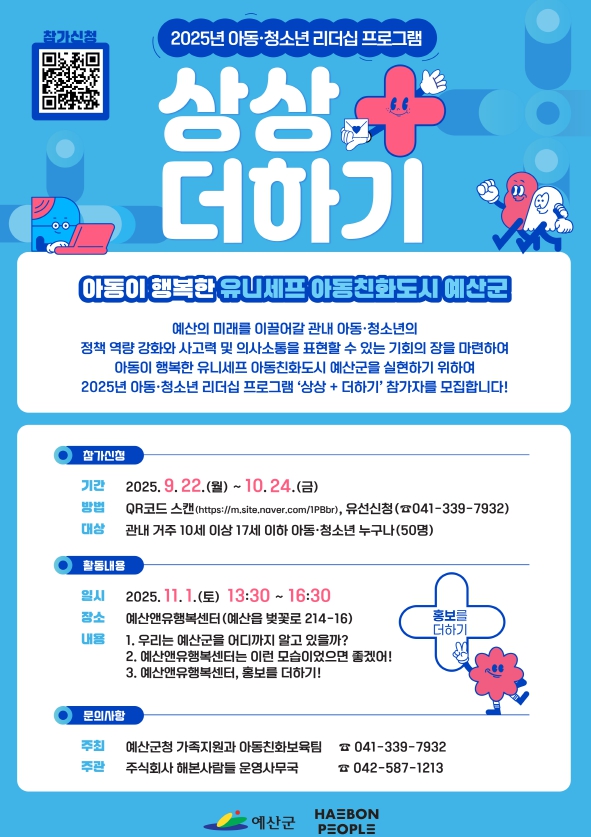 [금요저널] 예산군은 아동·청소년이 주체가 돼 아동친화도시 조성에 참여하는 ‘상상+더하기 아동·청소년 리더십 프로그램’의 참가자 모집기간을 기존 10월 17일에서 24일까지로 연장했다고 밝혔다.