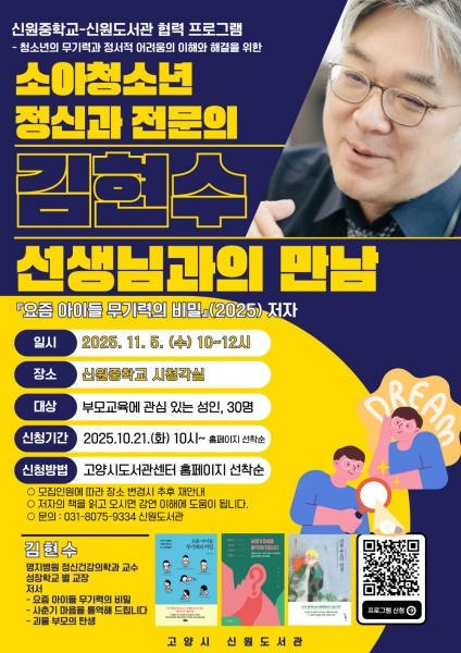 김현수 전문의는 ‘요즘 아이들 무기력의 비밀’‘사춘기 마음을 통역해 드립니다’등을 내고 ‘성장학교 별’의 교장으로서 청소년 이해와 올바른 자녀교육을 위해 노력해왔으며 그의 강연과 질의응답 프로그램은 11월 5일 수요일 10시부터 신원중학교에서 진행한다.