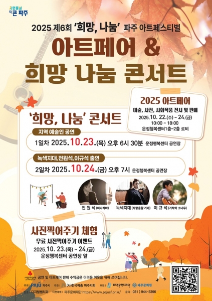 [금요저널] 파주시가 주최하고 ㈔한국예술문화단체총연합회 파주지회에서 주관하는 ‘2025 제6회 ‘희망, 나눔’ 파주 아트페스티벌’ 이 10월 22일부터 24일까지 3일간 운정행복센터에서 개최된다.