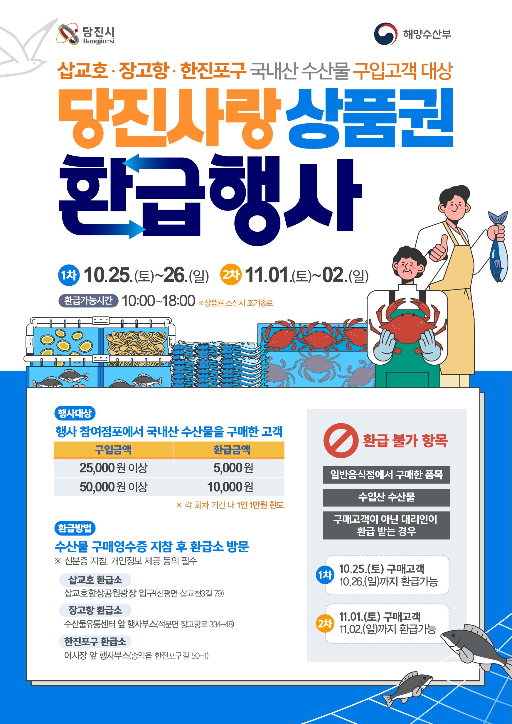 [금요저널] 당진시(시장 오성환)는 가을철을 맞아 오는 10월 25일과 26일 이틀간 국내산 수산물을 구매한 고객에게 최대 20%를 당진사랑상품권으로 환급하는 행사를 진행한다고 22일 밝혔다.