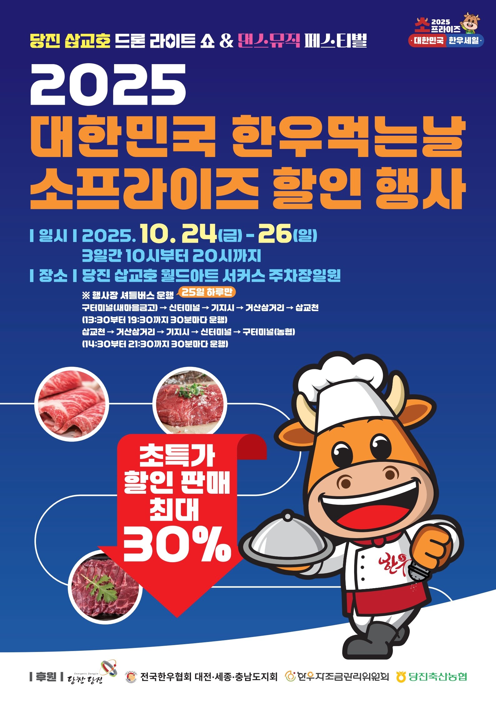 오는 10월 24일부터 26일까지는 삽교천 댄스&뮤직 페스티벌 현장에서 ‘2025 대한민국 한우먹는날 소프라이즈 한우 할인행사’
