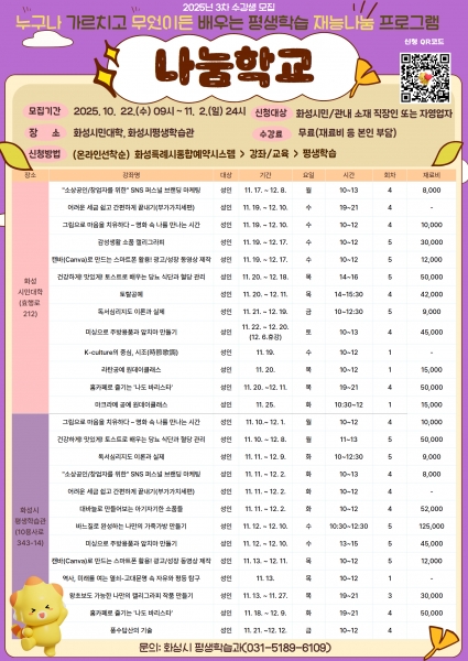 [금요저널] 화성특례시가 22일부터 11월 2일까지 2025년 3차 나눔학교 수강생을 선착순 모집한다.