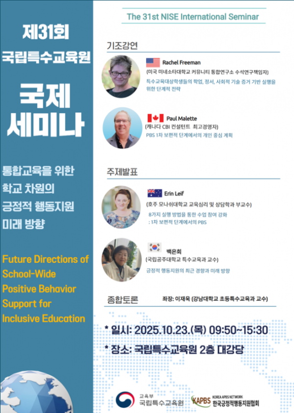 [금요저널] 국립특수교육원은 한국긍정적행동지원협회와 공동으로 10월 23일 ‘통합교육을 위한 학교 차원의 긍정적 행동지원 미래 방향’을 주제로 ‘제31회 국제세미나’를 개최한다.
