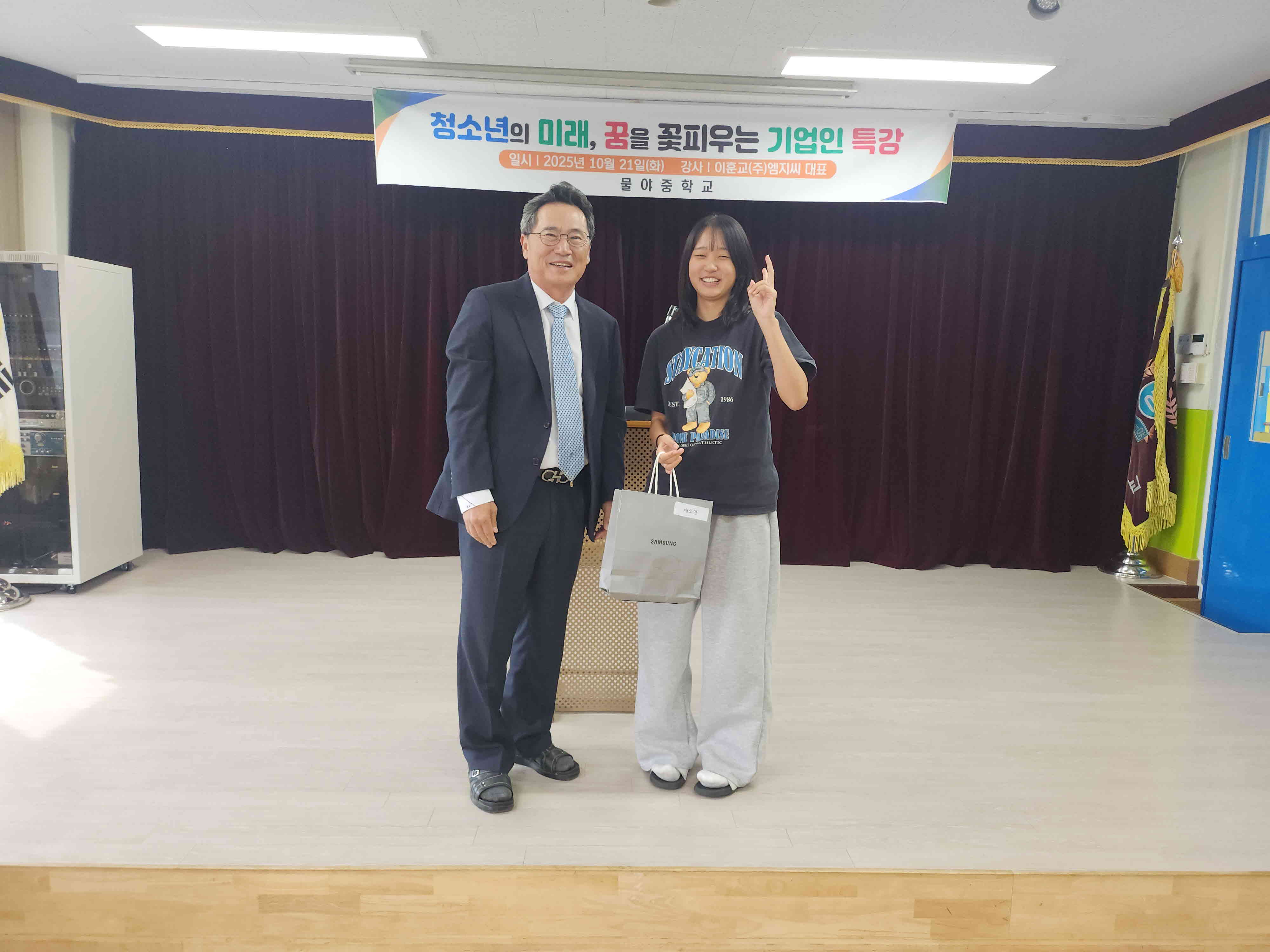 이훈교 대표는 올해 상반기에도 물야중학교 학생들에게 여성용품을 기증한 바 있으며, 당시 전교생이 감사의 마음을 담아 이 대표에게 손 편지를 보냈다. 이 편지에 깊은 감동을 받은 이 대표는 학생들의 학습과 성장을 응원하기 위해 태블릿 PC를 선물하고, 진로와 연계한 기업인 특강도 함께 진행하였다.