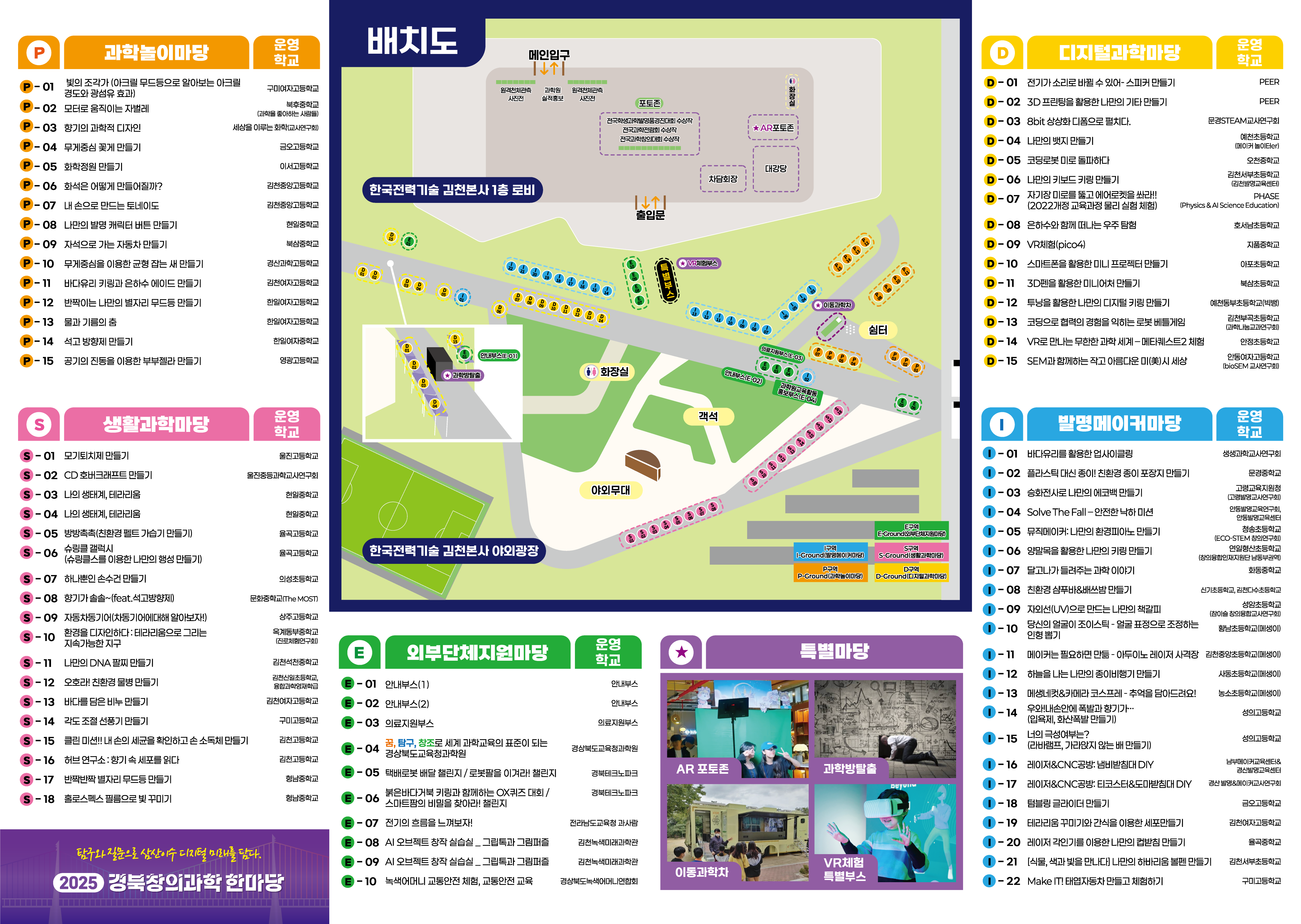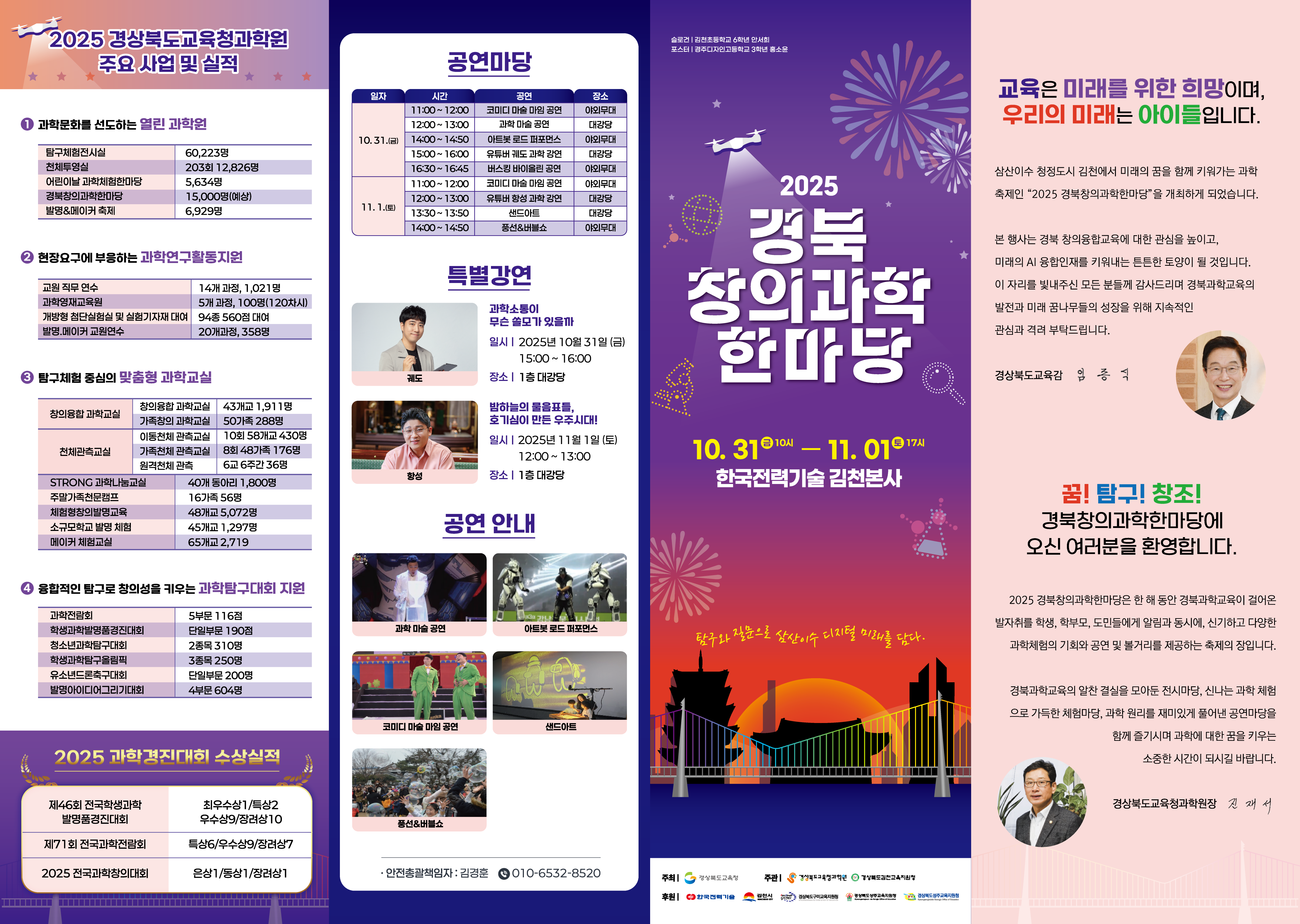 ■ 2025 경북창의과학한마당이 10월 31일(금)부터 11월 1일(토)까지 삼산이수 청정도시 김천에서 『탐구와 질문으로 삼산이수 디지털 미래를 담다』라는 주제로 한국전력기술 김천본사(김천시 혁신로 269)에서 개최된다.