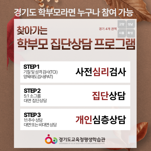 23일부터 고양을 시작으로 성남, 시흥, 화성 등 경기도 내 4개 권역에서 순차적으로 진행되는 이번 프로그램은 전문 상담사와의 소그룹 상담을 통해 학부모가 서로 경험을 공유하고 정서적 안정을 도모할 수 있도록 기획됐다.
