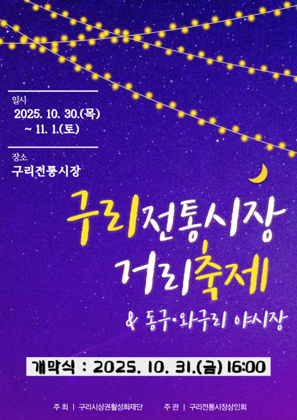 같은 기간 구리 전통시장과 구리역 골목형 상점가에서는 ‘동구·와구리 야시장’ 이 운영된다.