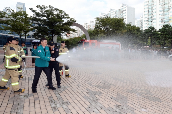 이날 훈련은 실질적인 화재 대응능력 향상을 위해 청사 5층에서 원인 미상의 화재 발생을 가정하고 직원 및 민원인 긴급대피, 층별 소화기 및 소화전을 이용한 초동 진화, 응급환자 발생 시 환자 긴급 후송과 화재진화 교육 실습도 진행됐다.