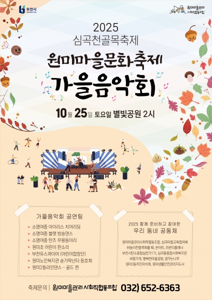[금요저널] 부천시는 10월 25일 원미별마루와 별빛공원 일대에서 ‘2025년 심곡천 골목축제–원미마을문화축제 가을 음악회’를 연다.