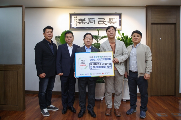[금요저널] 남양주시는 23일 시청 시장실에서 남양주시 주민자치협의회가 지역 내 취약계층 지원을 위해 1,600만원의 후원금을 남양주시복지재단에 기탁했다고 밝혔다.