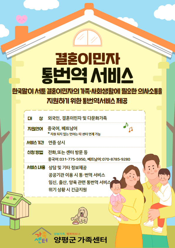 한편 결혼이민자 통·번역 서비스 신청 및 지원사항, 한국 정착 관련 초기상담 등은 양평군가족센터로 전화 문의하면 자세한 안내를 받을 수 있다.