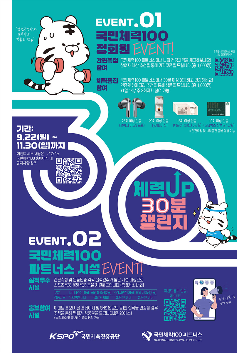 11월 30일까지 ‘체력업(up) 30분 챌린지’ 이벤트도 진행된다. ‘국민체력100’ 홈페이지 가입 후 목동·신월보건지소에 방문해 30분간 운동에 참여하면 자동 응모되며, 누적 실천 횟수에 따라 추첨을 통해 경품 혜택도 주어진다.
