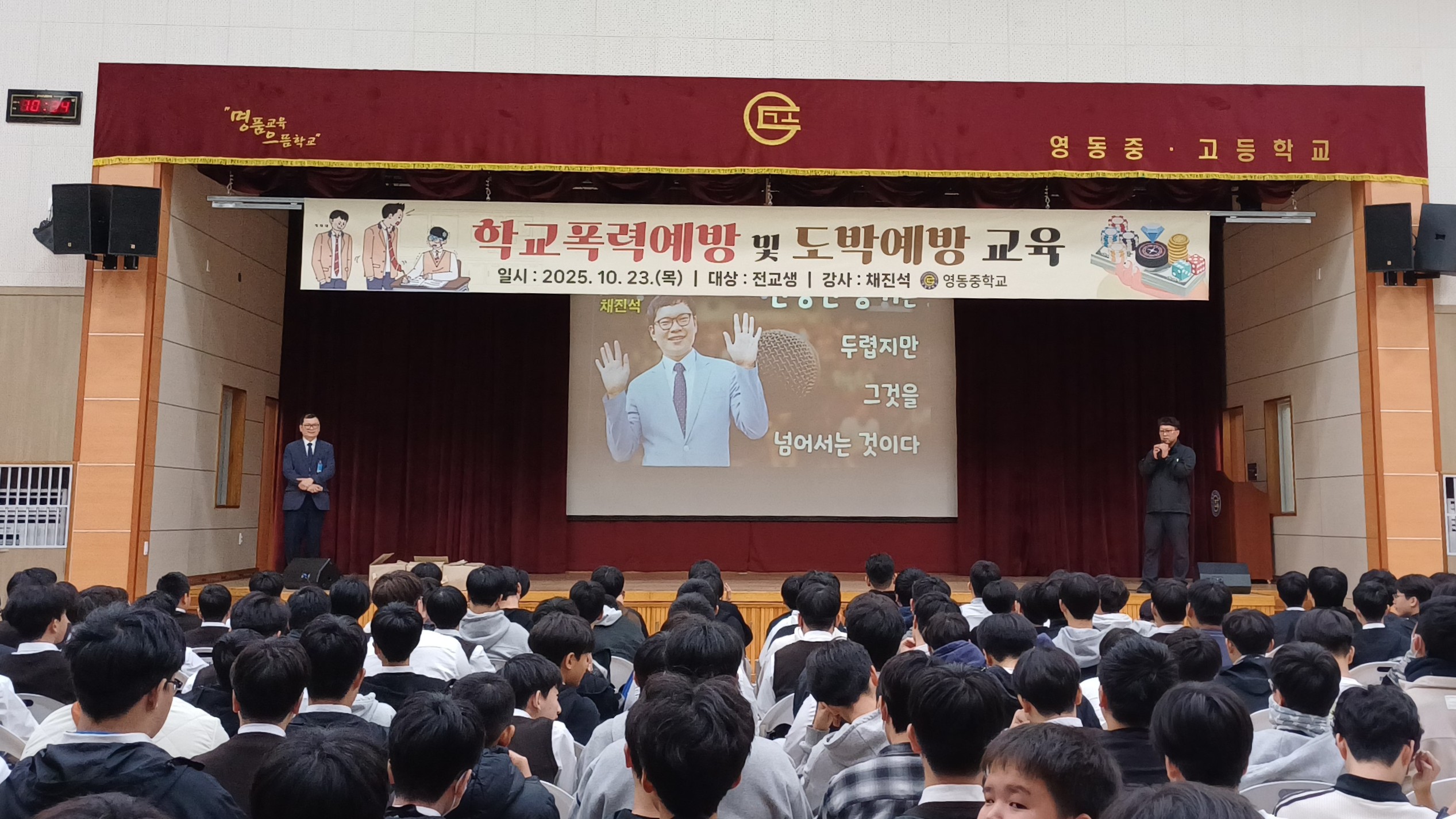 □ 영동중학교(교장 안명환)는 2025년 10월 23일(목) 3~4교시에 전교생을 대상으로‘학교폭력예방’및‘도박예방교육’을 실시하였다.