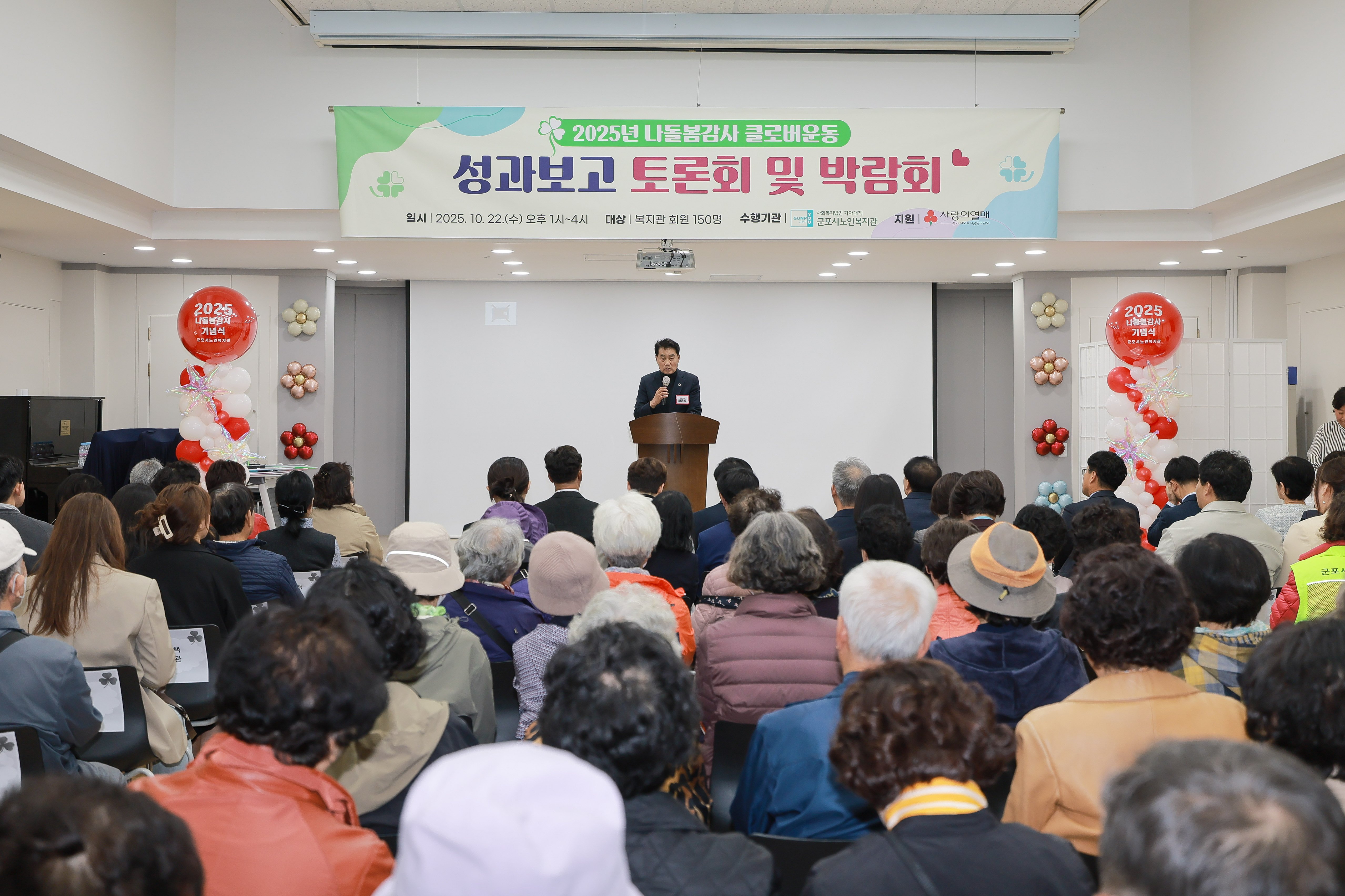 [금요저널] 군포시노인복지관(관장 윤호종)은 10월 22일 복지관 2층 강당과 운동장에서 ‘2025년 나돌봄감사 클로버운동 성과보고 토론회 및 박람회’를 300여명의 내외빈이 참석한 가운데 성황리에 개최했다.