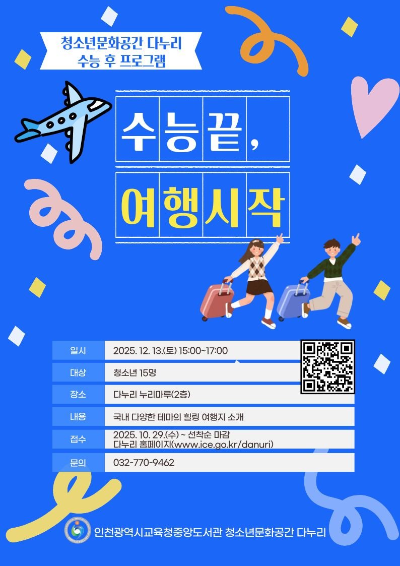 [금요저널] 인천광역시교육청중앙도서관(관장 곽미혜) 청소년문화공간 다누리는 수능을 마친 고3 수험생과 청소년들의 심리적 안정과 자기돌봄을 돕기 위해 ‘2025년 수능 후 프로그램’을 11월 15일(토)과 12월 13일(토) 두 차례 운영한다.