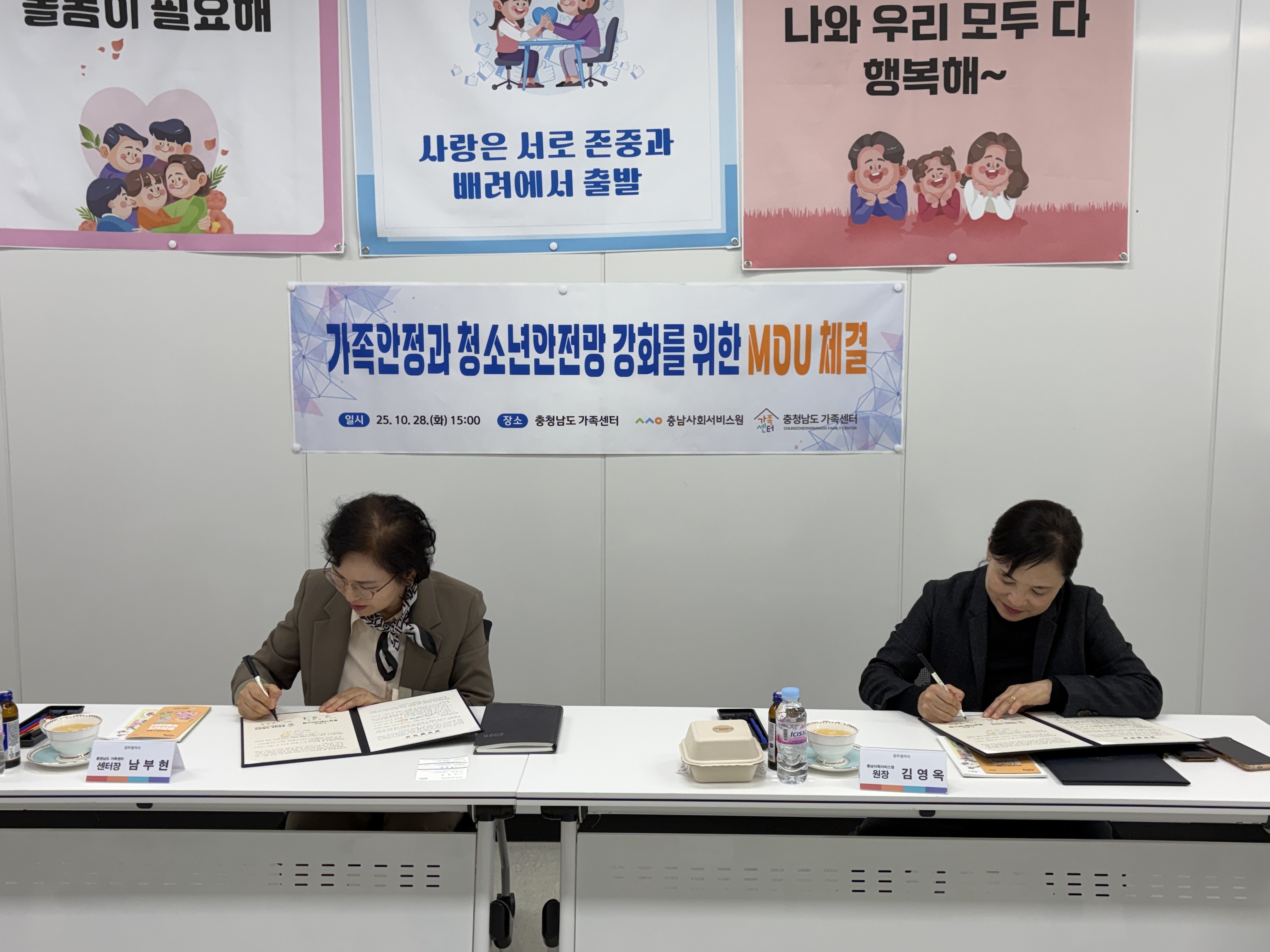이번 협약은 김영옥 충남사회서비스원장, 남부현 충청남도가족센터장을 비롯한 주요 관계자들이 참석해 가족의 안정과 지역사회 청소년을 위해 향후 협력 방향에 대한 논의를 나누었다.