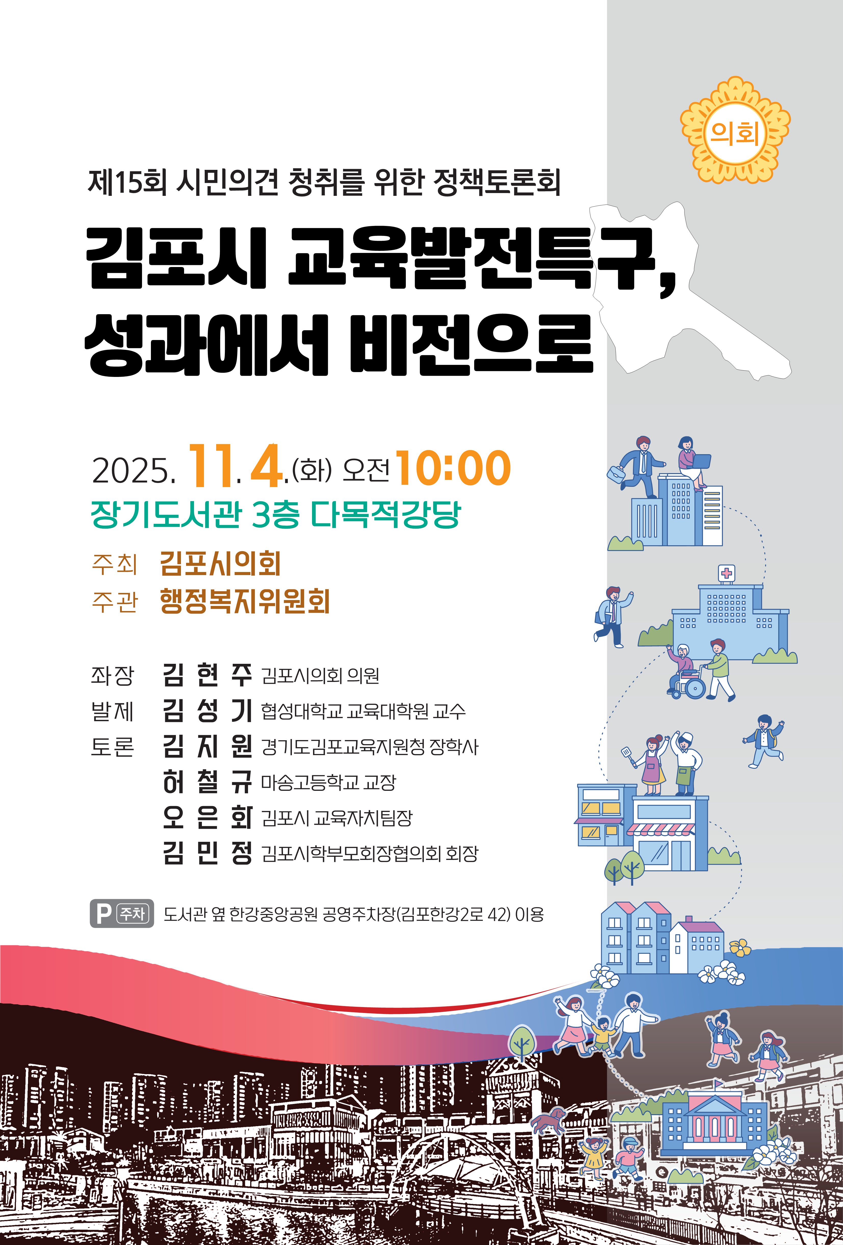 [금요저널] 김포시의회는 김포시 교육발전특구의 추진 성과를 점검하고 향후 비전과 정책 방향을 모색하기 위해 오는 11월 4일 장기도서관 3층 다목적강당에서 정책토론회를 개최한다.
