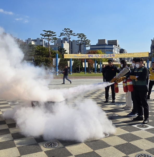 이날 훈련에는 평택시청 상주 직원과 비전119안전센터 소방대원 등 200여명이 참여했으며 △신속한 화재 통보 △청사 내 대피 유도 △소화전을 이용한 초기 화재 진화 △소방차 진출입로 확보 및 차량 통제 △모의화재 소화기 진압훈련 등 실제 상황을 가정한 프로그램으로 구성됐다.