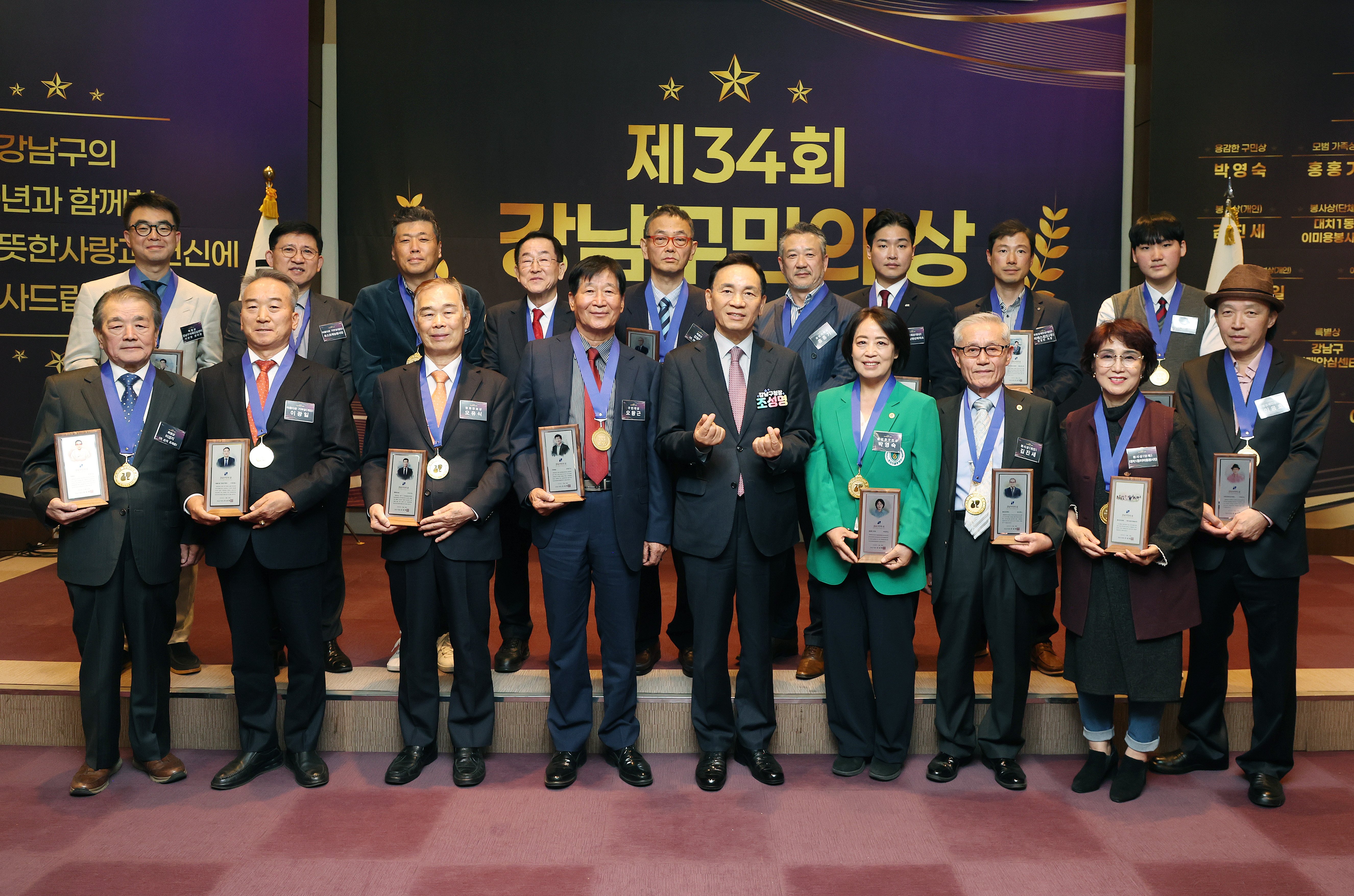 [금요저널] 꿈이 모이는 도시, 미래를 그리는 강남구(구청장 조성명)가 지난 10월 28일 코엑스 컨퍼런스룸에서 ‘제34회 강남구민의 상’시상식을 열고 지역사회 발전과 주민 복지 증진에 기여한 구민 12명과 5개 단체(법인)에 상을 수여했다.