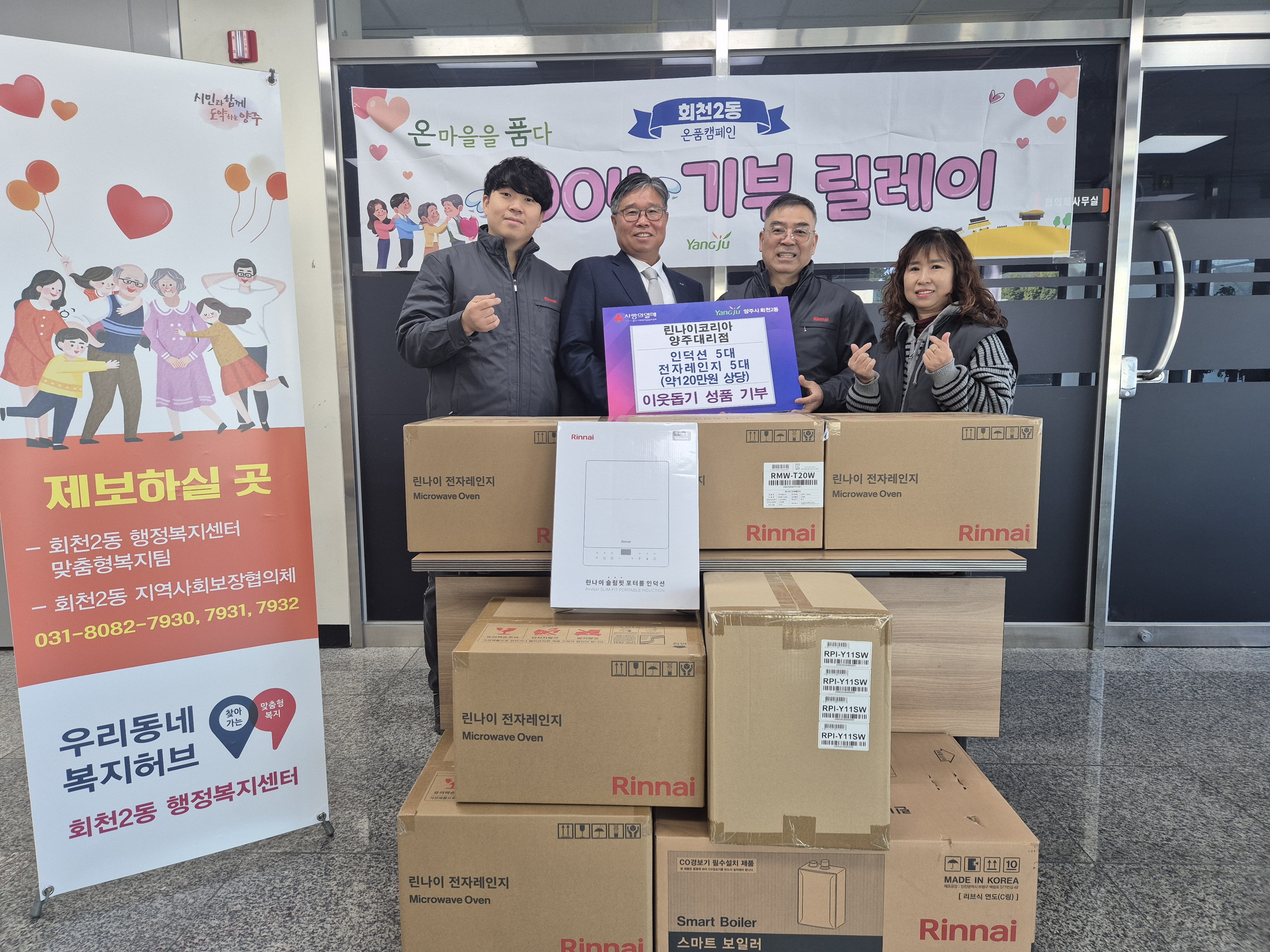 [금요저널] 양주시 회천2동(동장 지상민) 소재 린나이 공식대리점(캐스케이드 시스템 전문점)이 지난 28일 저소득 취약계층의 주거환경 개선을 위해 인덕션 5대와 전자레인지 5대(환산가액 총 120만원)를 기부했다.