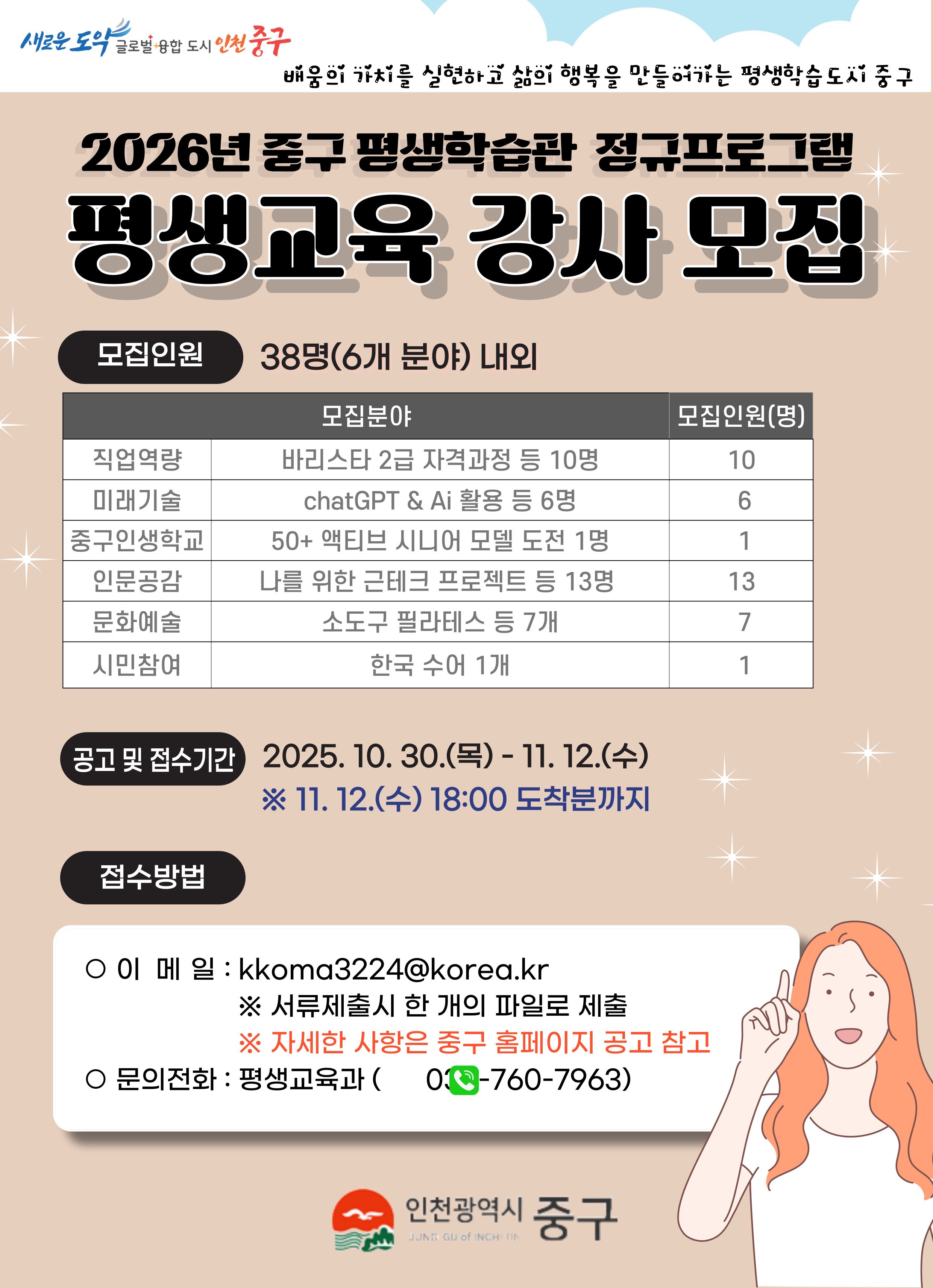 [금요저널] 인천시 중구는 오는 2026년 한 해 동안 중구 평생학습관에서 정규 프로그램을 담당할 전문성과 열정을 갖춘 전문 강사 38명을 공개 모집한다고 31일 밝혔다.